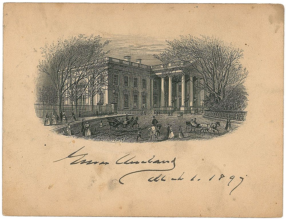 Engraved portrait of the exterior of the White House, 4.75 x 3.5, signed under the image, as president, “Grover Cleveland, March 1, 1897.” In very good condition, with scattered toning and soiling.