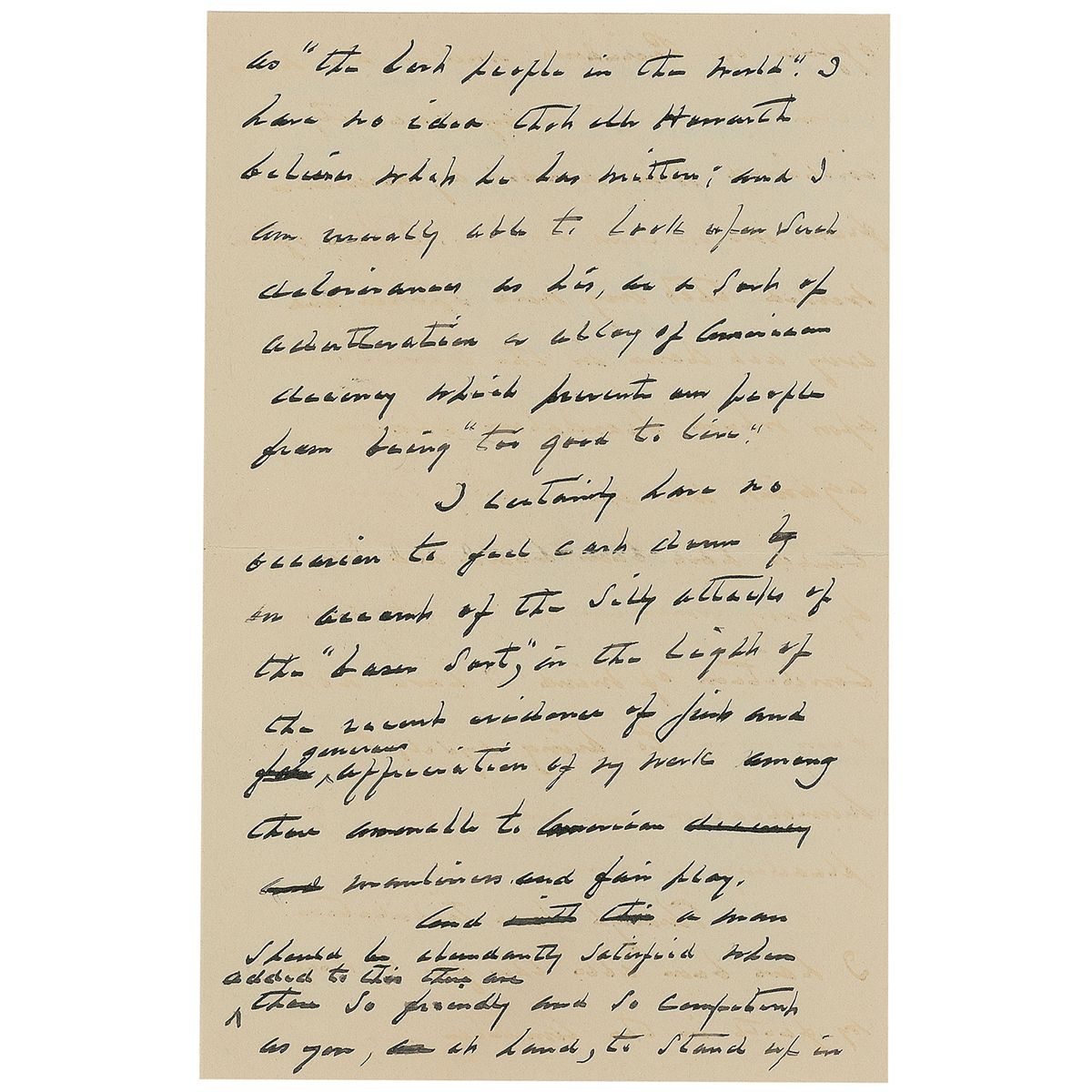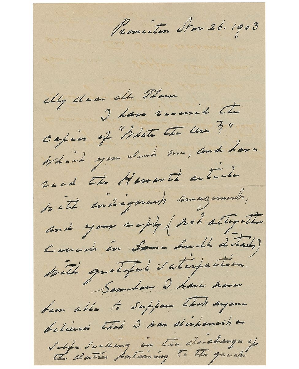 Excellent ALS from Cleveland to Frank M. Thorn of New York. ALS, four pages on two adjoining sheets, 4.25 x 6.75, November 26, 1903. In full: “I have received the copies of ‘What’s the use?’ which you sent me, and have read the Horvath article with indignant amazement, and your reply, (not altogether correct in some small details), with grateful satisfaction.