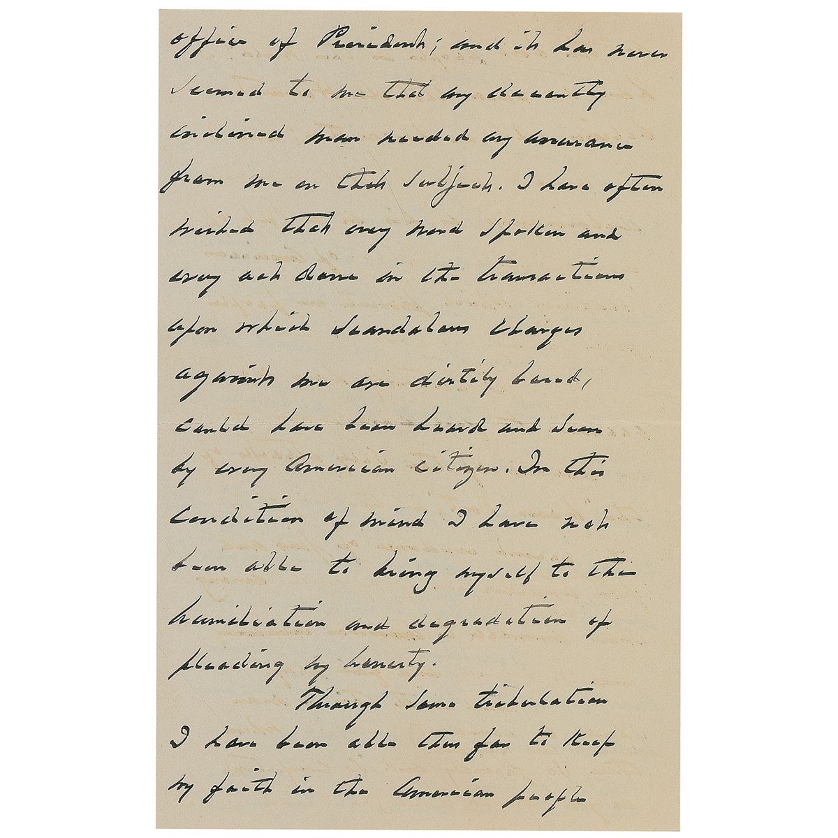 Somehow I have never been able to suppose that anyone believed that I was dishonest or self-serving in the discharge of the duties pertaining to the great office of President; and it has never seemed to me that any decently inclined man needed any assurance from me on that subject. I have often wished that any word spoken and every act done in the transactions upon which scandalous charges against me are dirtily based, could have been heard and seen by every American citizen. In this condition of mind I have not been able to bring myself to the humiliation and degradation of pleading my honesty.