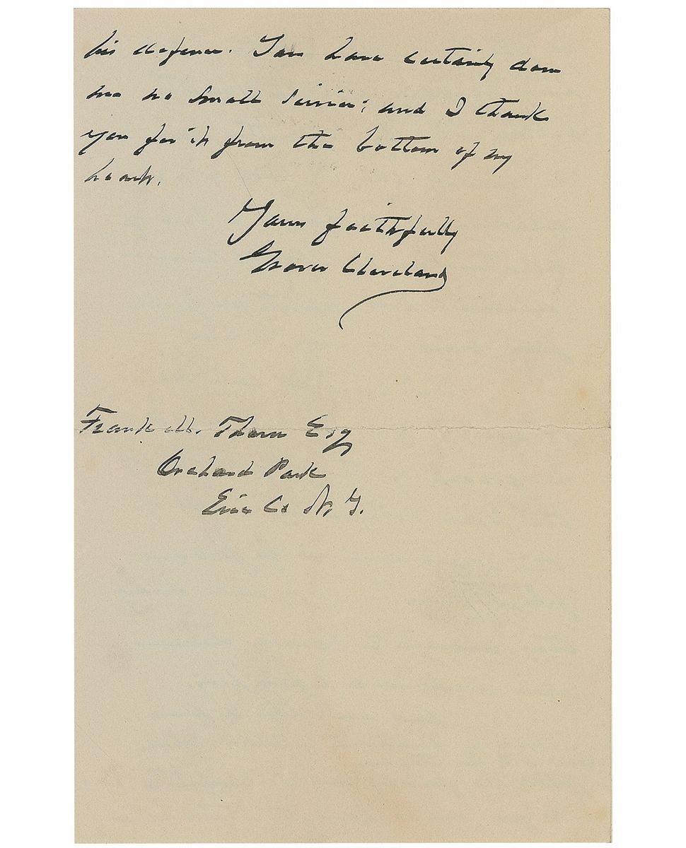 And a man should be abundantly satisfied when added to this there are those so friendly and so competent as you, at hand, to stand up in his defense. You have certainly done me no small service; and I thank you for it from the bottom of my heart.” In fine condition, with a tiny edge separation at horizontal mailing fold. Accompanied by the original mailing envelope, addressed in Cleveland’s hand.