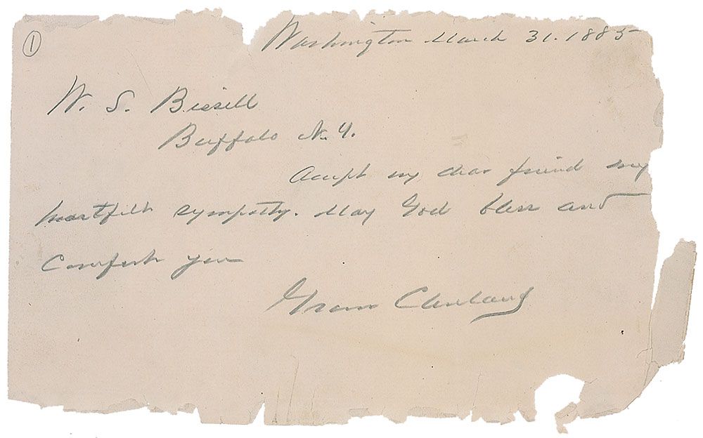 ALS in pencil as president, one page, 9 x 5.5, March 31, 1885. Letter to his former law partner, W. S. Bissell of Buffalo. In full: “Accept my dear friend my heartfelt sympathy. May God bless and comfort you.” In very good condition, with two vertical folds (one vertical fold passing through a single letter of the signature), and various tears and paper loss to edges.