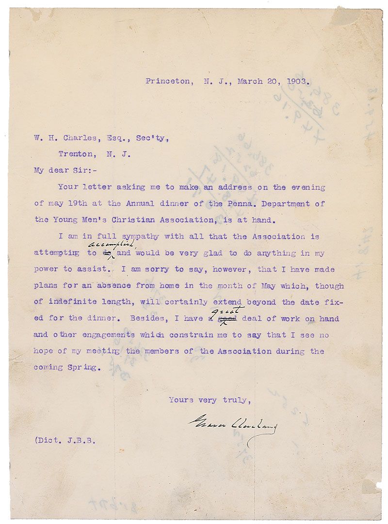 TLS, one page, 7.5 x 10.75, March 20, 1903. Letter to W. H. Charles declining a speaking invitation. In part: “Your letter asking me to make an address…at the Annual dinner of the Penna. Department of the Young Men’s Christian Association, is at hand. I am in full sympathy with all that the Association is attempting to accomplish and would be very glad to do anything in my power to assist. I am sorry to say, however, that I have made plans for an absence from home in the month of May which, though of indefinite length, will certainly extend beyond the date fixed for the dinner.” Cleveland has also made two handwritten corrections to the letter’s text. In very good condition, with intersecting folds, one through a single letter of signature, scattered toning and creases, and show-through from mathematical equations on the reverse in an unknown hand.