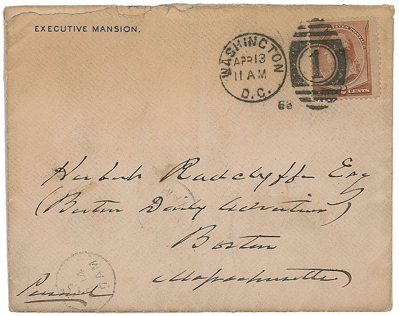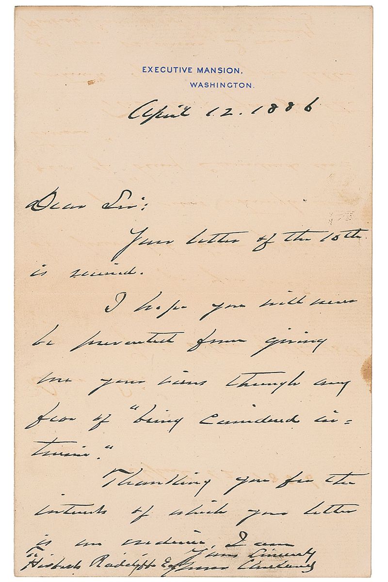 ALS as president, one page, 5 x 8, Executive Mansion letterhead, April 12, 1886. Letter to Herbert Radclyffe Esquire. In full: “Your letter of the 10th is received. I hope you will never be prevented from giving me your time through any fear of ‘being considered intrusive.’ Thanking you for the interests of which your letter is an evidence.” In fine condition, with central horizontal and vertical folds, a light brush to cramped signature, and a tiny stain to right edge. Accompanied by the original mailing envelope addressed in Cleveland’s hand.