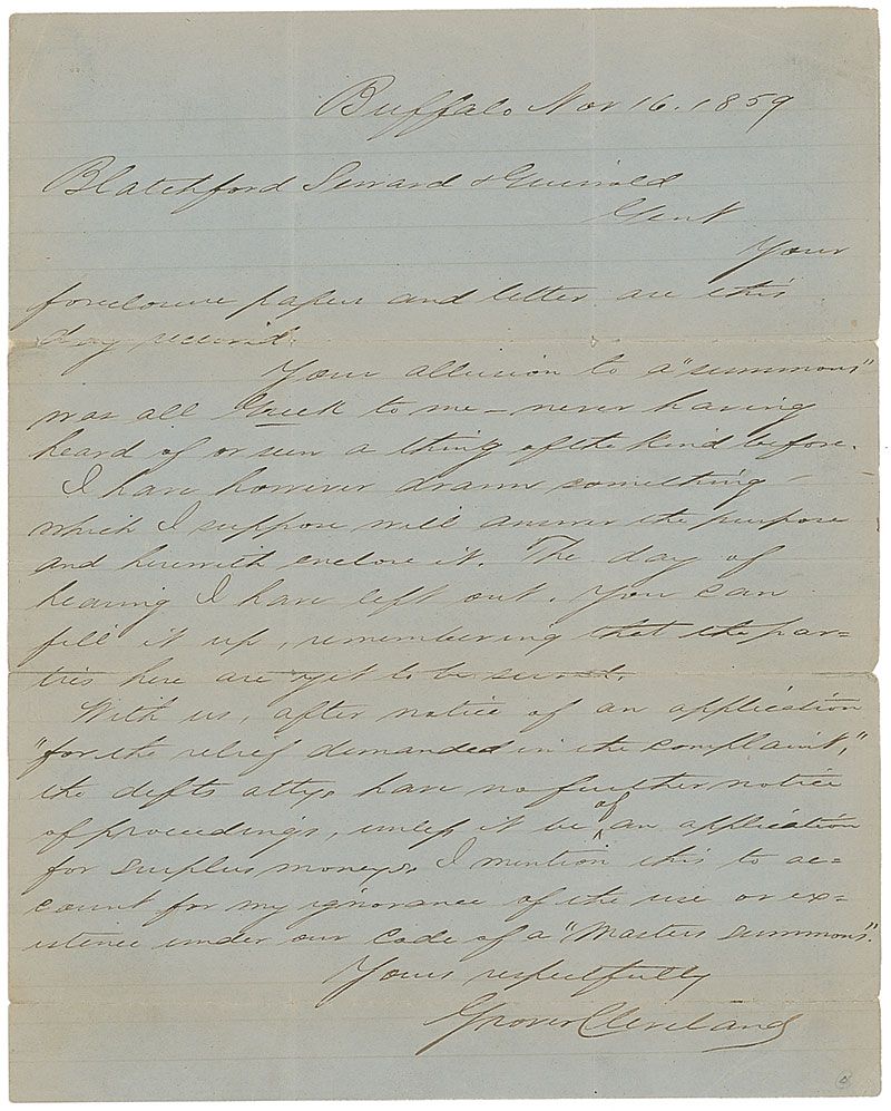 Early ALS, one page, lightly-lined, 8 x 10, November 16, 1859. Letter to the law firm of Blatchford, Seward, and Griswold. In part: “Your allusion to a ‘summons’ was all Greek to me, never having heard of or seen a thing of the kind before. I have however drawn something which I suppose will answer the purpose…With us, after notice of an application ‘for the relief demanded in the complaint’ the defts attys have no further notice of proceedings, unless, it be of an application for surplus moneys. I mention this to account for my ignorance of the use or existence under our code of a ‘Master summons.’” In very good condition, with partial separations along intersecting folds, a fold through a single letter of signature, and scattered light toning and soiling. The law firm of Blatchford, Seward, and Griswold represented many prominent inventors in the 19th century, including Samuel F. B. Morse, Charles Goodyear, and Elias Howe, Jr. BS&G also provided consul for both individuals and companies accused of copyright infringement and for inventors bringing lawsuits. One of its founders, Samuel Blatchford, would go on to serve as an associate justice of the United States Supreme Court.