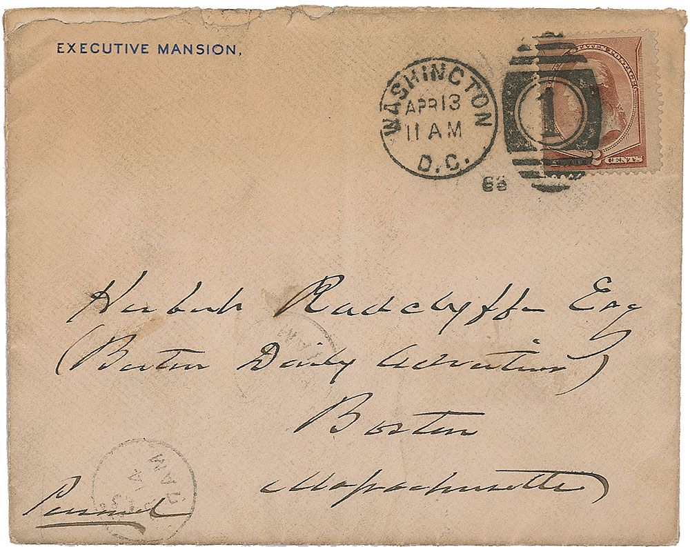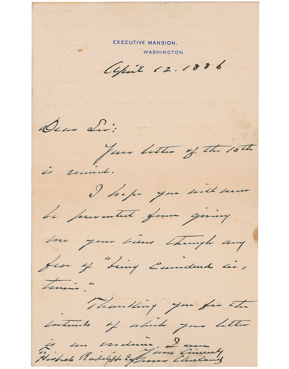 ALS as president, one page, 5 x 8, Executive Mansion letterhead, April 12, 1886. Letter to well-known investor and philanthropist Herbert Radclyffe. In full: “Your letter of the 10th is received. I hope you will never be prevented from giving me your time through any fear of ‘being considered intrusive.’ Thanking you for the interests of which your letter is an evidence.” Scattered toning, mirroring of ink to upper portion, mounting remnants to reverse of integral second page, and Cleveland’s signature a bit cramped along bottom edge, otherwise fine condition. Accompanied by the original mailing envelope addressed in Cleveland’s hand.