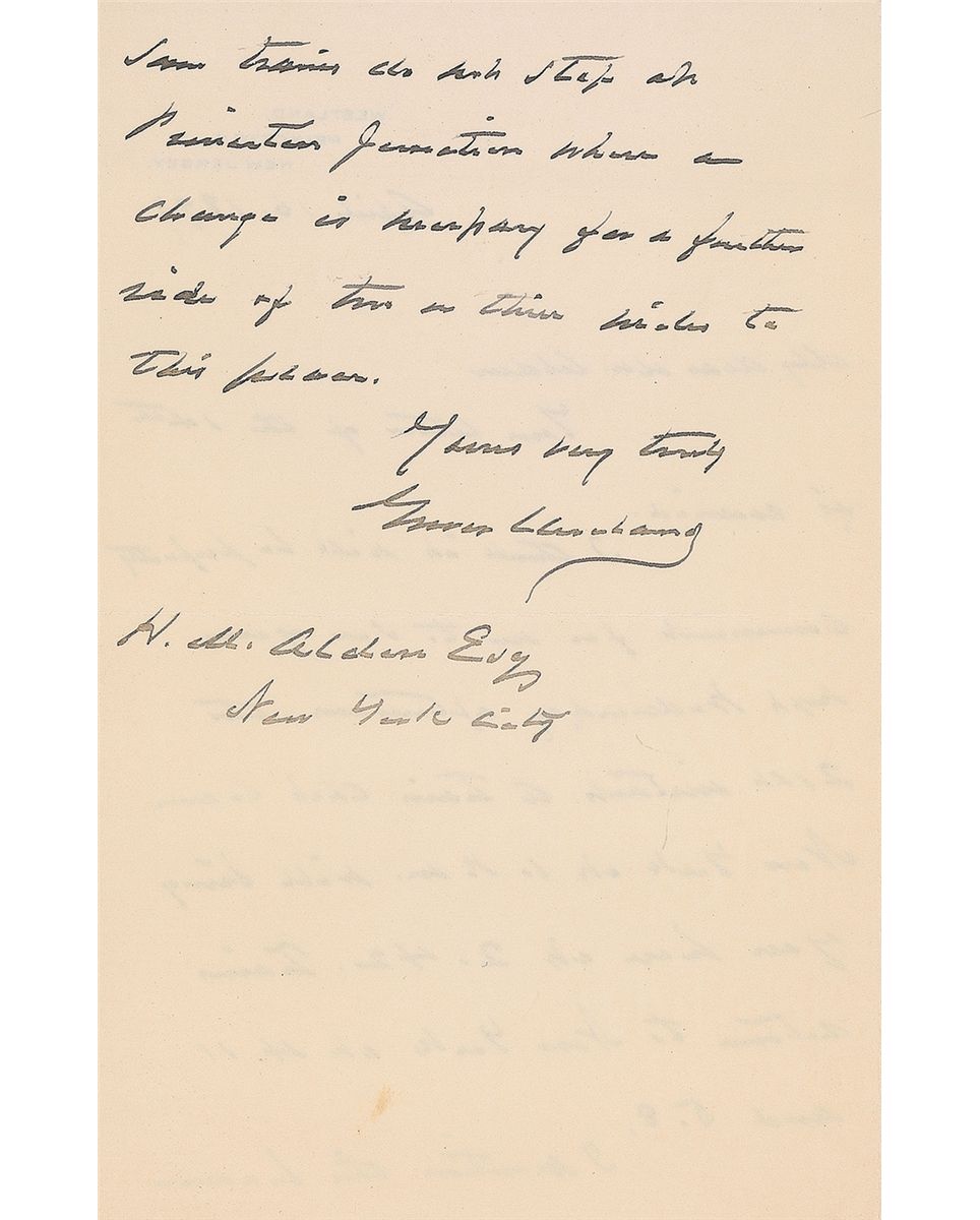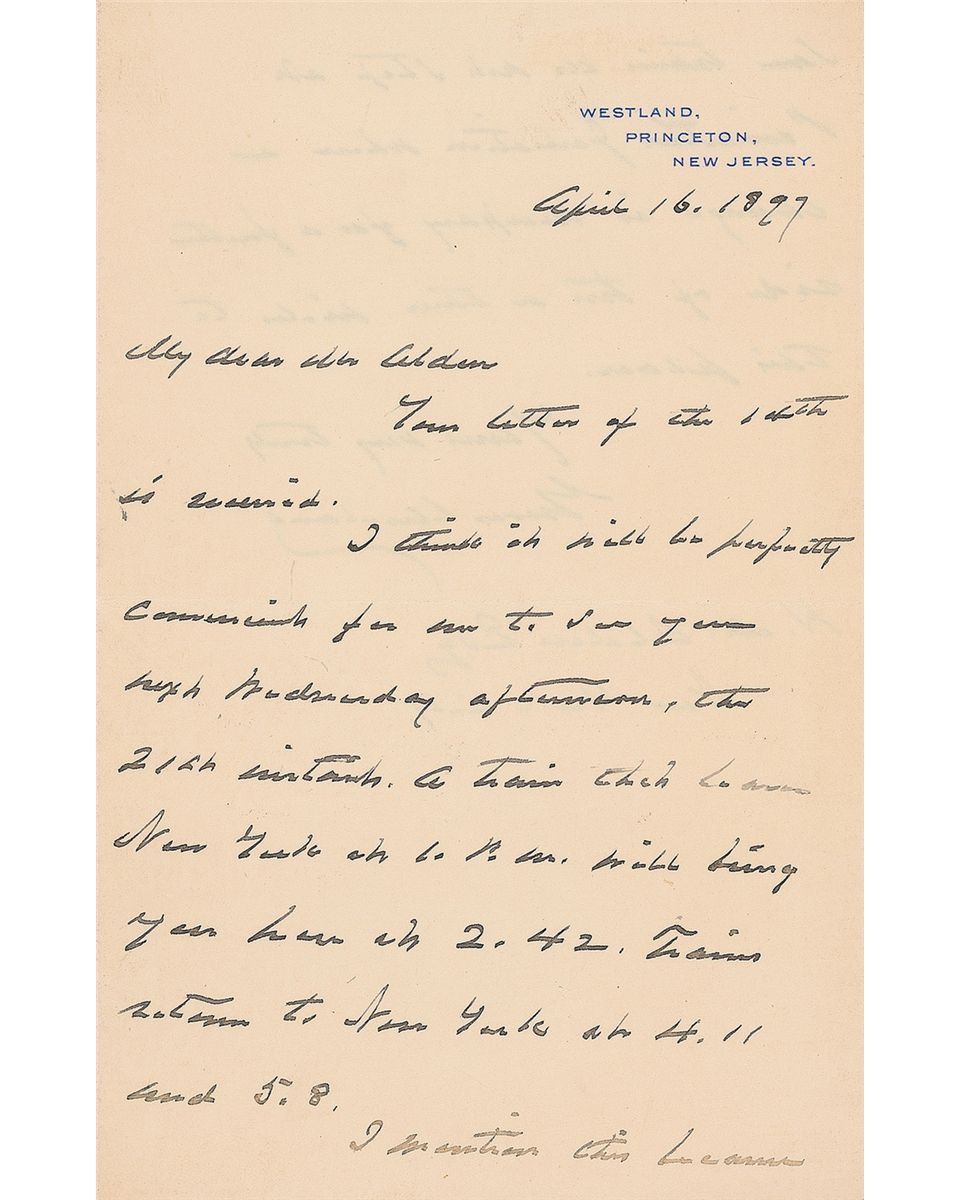 ALS, one page both sides, 4.5 x 7, personal letterhead, April 16, 1897. Letter to H. M. Alden of New York. In part: “I think it will be perfectly convenient for me to see you next Wednesday afternoon…A train that leaves New York at 1 p. m. will bring you here at 2.42. Trains return to New York at 4.11 and 5.8.” In fine condition. Accompanied by an engraved portrait of Cleveland bearing a pre-printed facsimile signature.