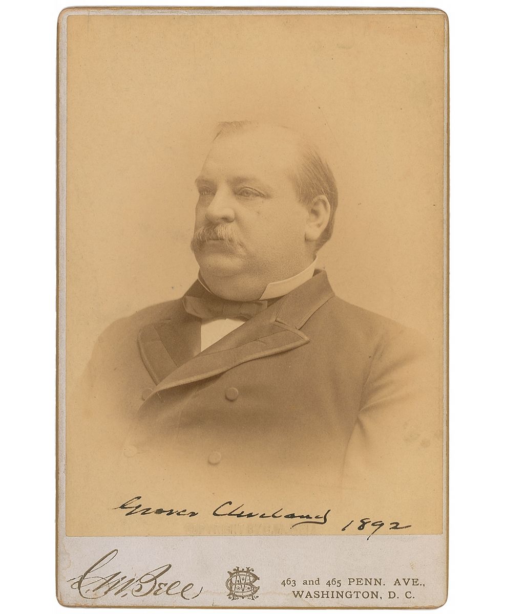 Highly desirable 4.25 x 6.5 cabinet bust portrait of Cleveland in a distinguished pose, signed at the bottom of the image in black ink, “Grover Cleveland 1892.” Published by C. M. Bell of Washington. In fine condition, with very subtle traces of dampstaining to bottom edge and scattered surface marks to reverse. Cleveland is the only president to have served non-consecutive terms, and this cabinet card was signed during the intermediary period—after leaving office in 1889, he was reelected on November 8, 1892, and settled back into the White House on March 4, 1893.