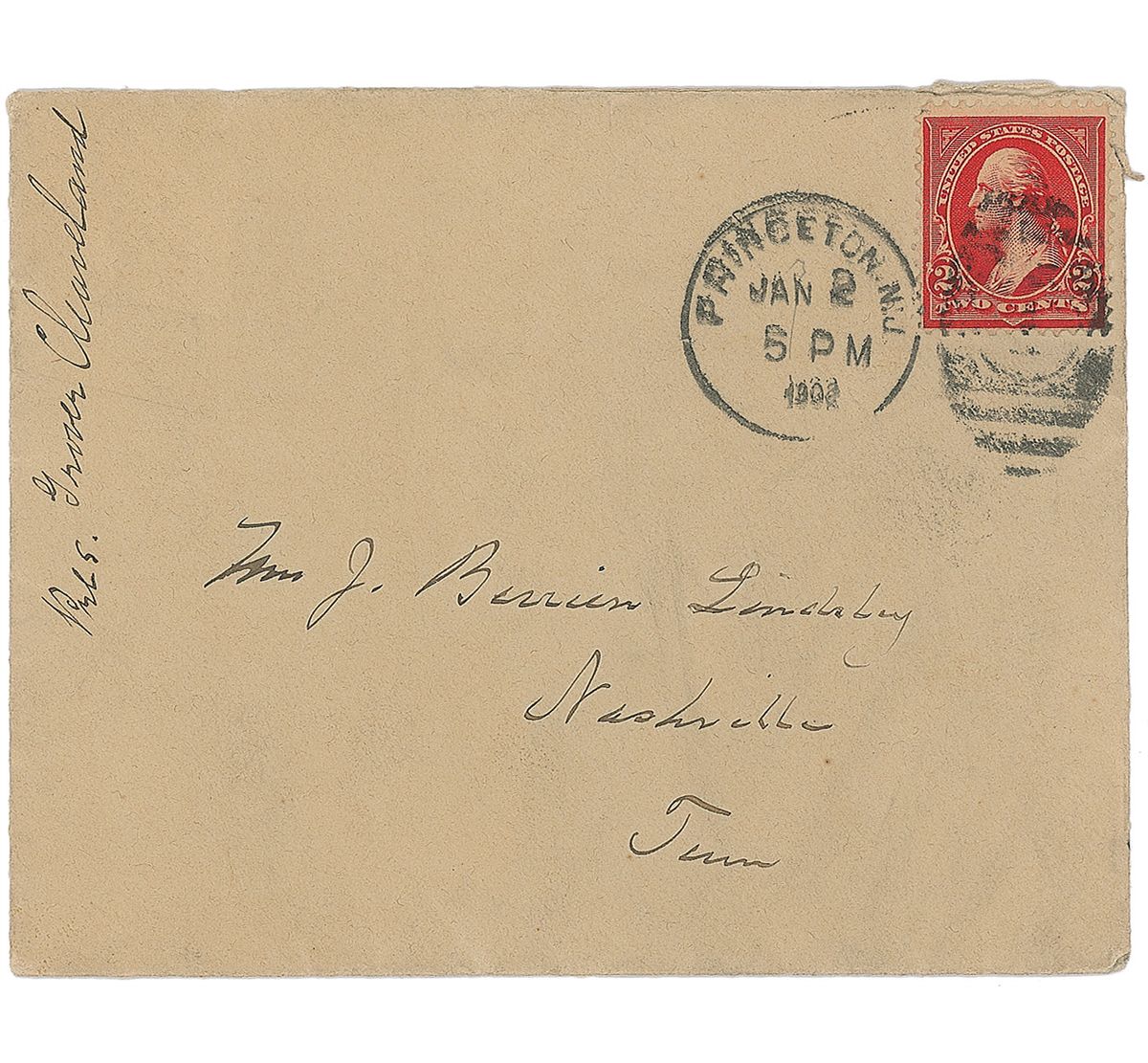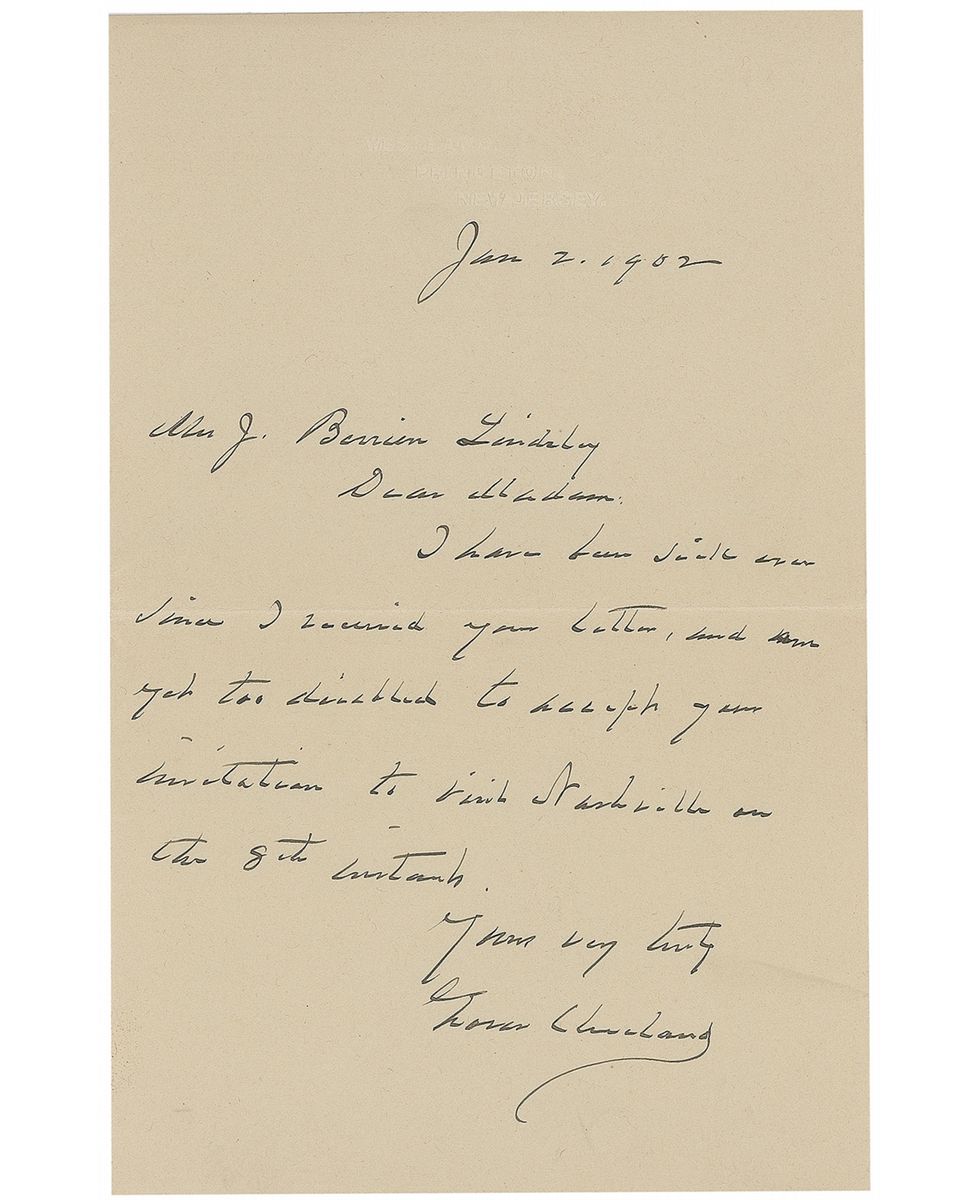 ALS, one page, 4.25 x 6.75, blind-embossed personal letterhead, January 2, 1902. Letter to Mrs. J. Berrien Lindsley. In full: “I have been sick ever since I received your letter, and am yet too disabled to accept your invitation to visit Nashville on the 8th instant.” In fine condition. Accompanied by the original mailing envelope, addressed in Cleveland’s hand.