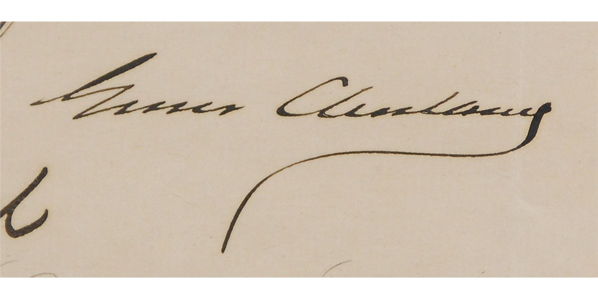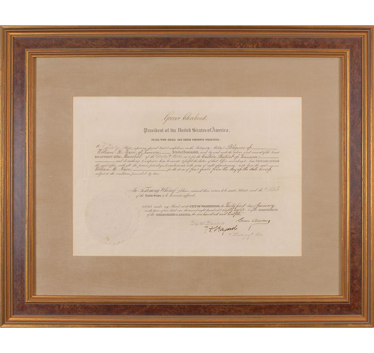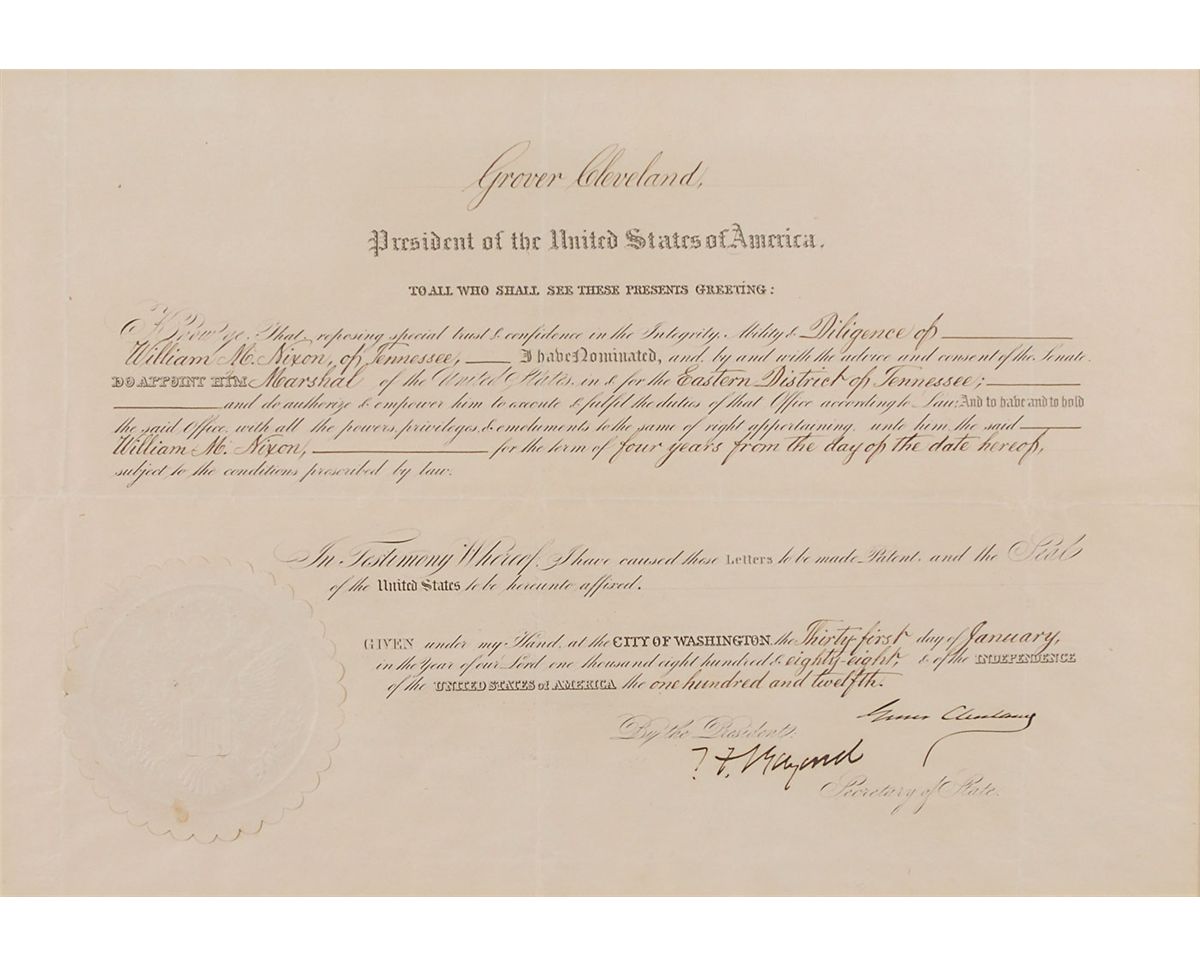 Partly-printed DS as president, one page, 15.5 x 10.75, January 30, 1888. President Cleveland appoints William M. Nixon of Tennessee as “Marshal of the United States in & for the Eastern District of Tennessee.” Boldly signed at the conclusion by President Cleveland and countersigned by Secretary of State Thomas F. Bayard. The crisply embossed paper seal affixed to the lower left remains fully intact with slight soiling. Handsomely suede-matted and framed to an overall size of 25 x 20.5. Intersecting folds and expected document wear, otherwise fine condition. Oversized.