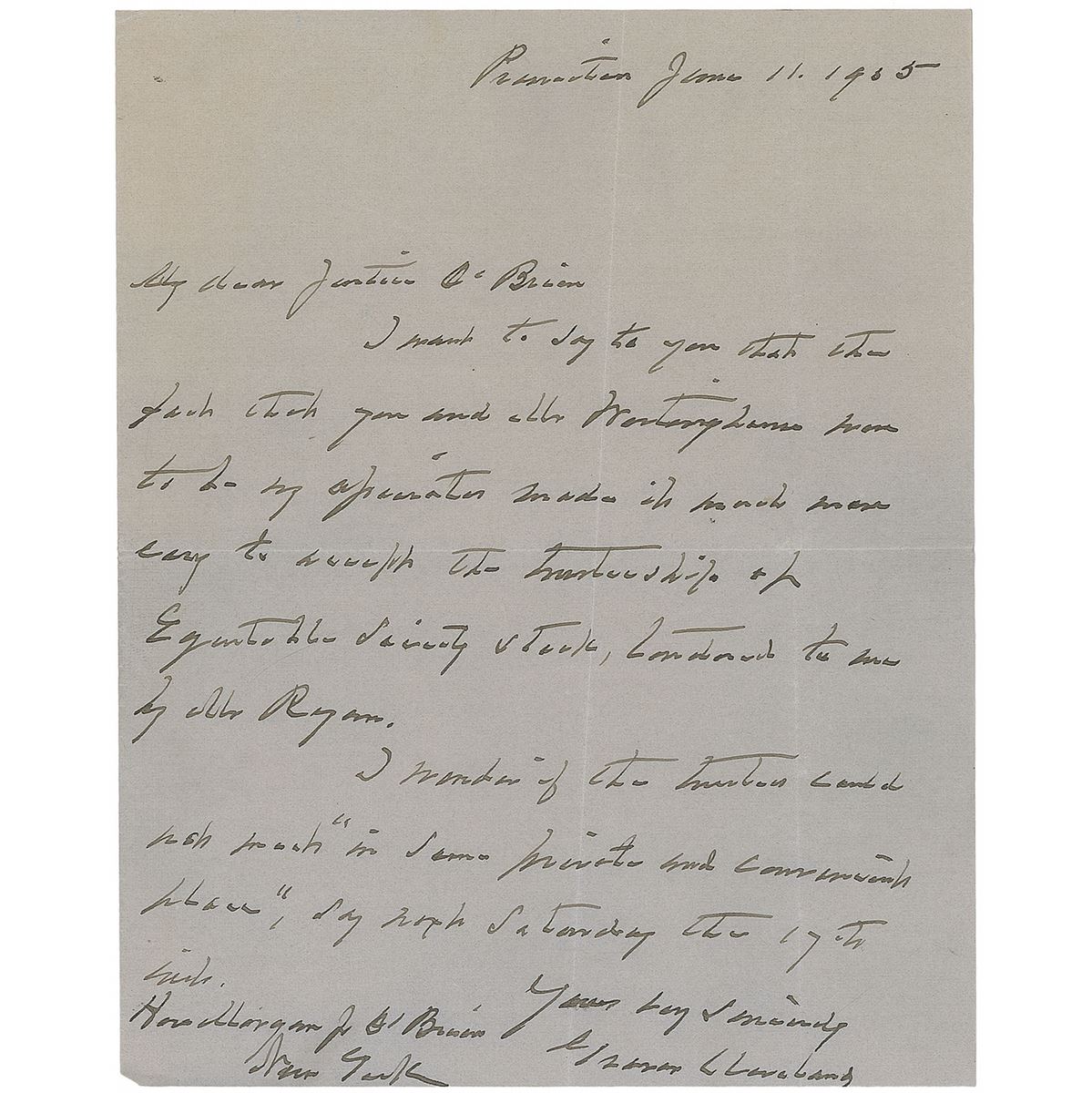 ALS, one page, 5.25 x 6.75, June 11, 1905. Letter to New York Supreme Court Judge Morgan J. O’Brien, in full: “I want to say to you that the fact that you and Mr. Westinghouse have to be my associates make it much more easy to accept the trusteeship…I wonder if the trustees could just meet ‘in some private and convenient place,’ say next Saturday the 17th.” In fine condition, with intersecting folds (two vertical folds passing through two letters of the signature) and trivial creasing.