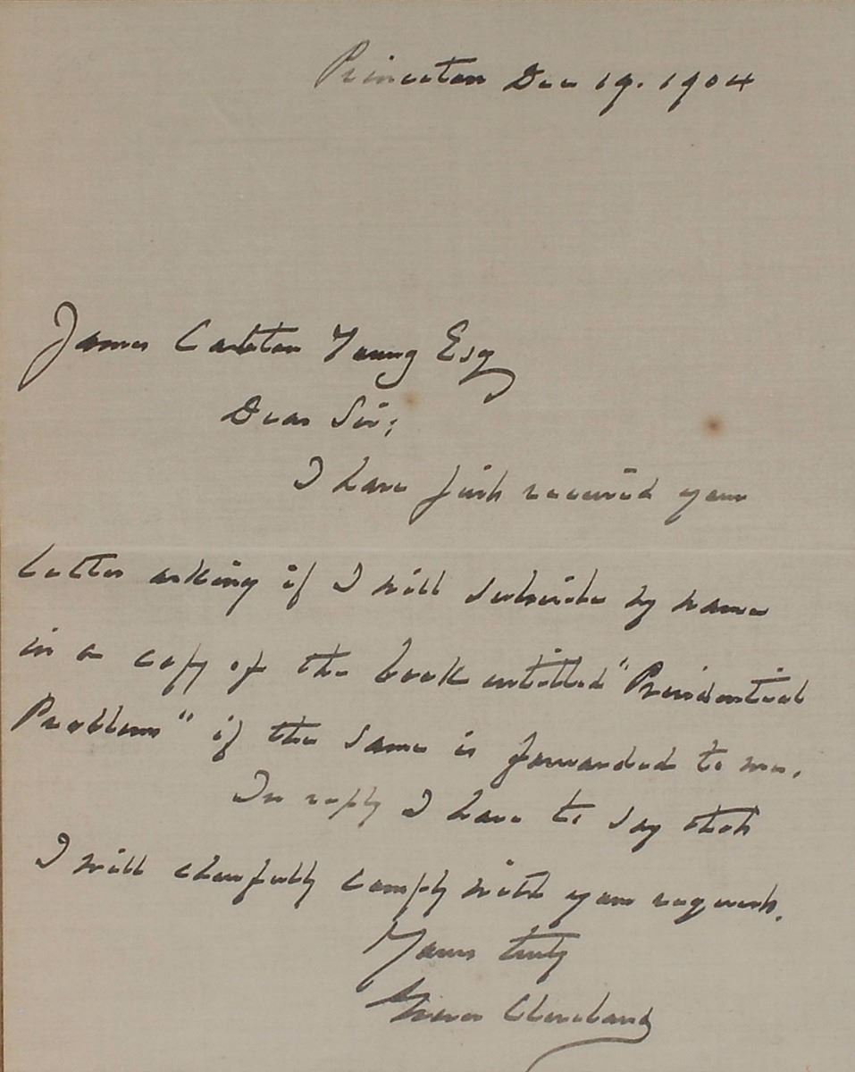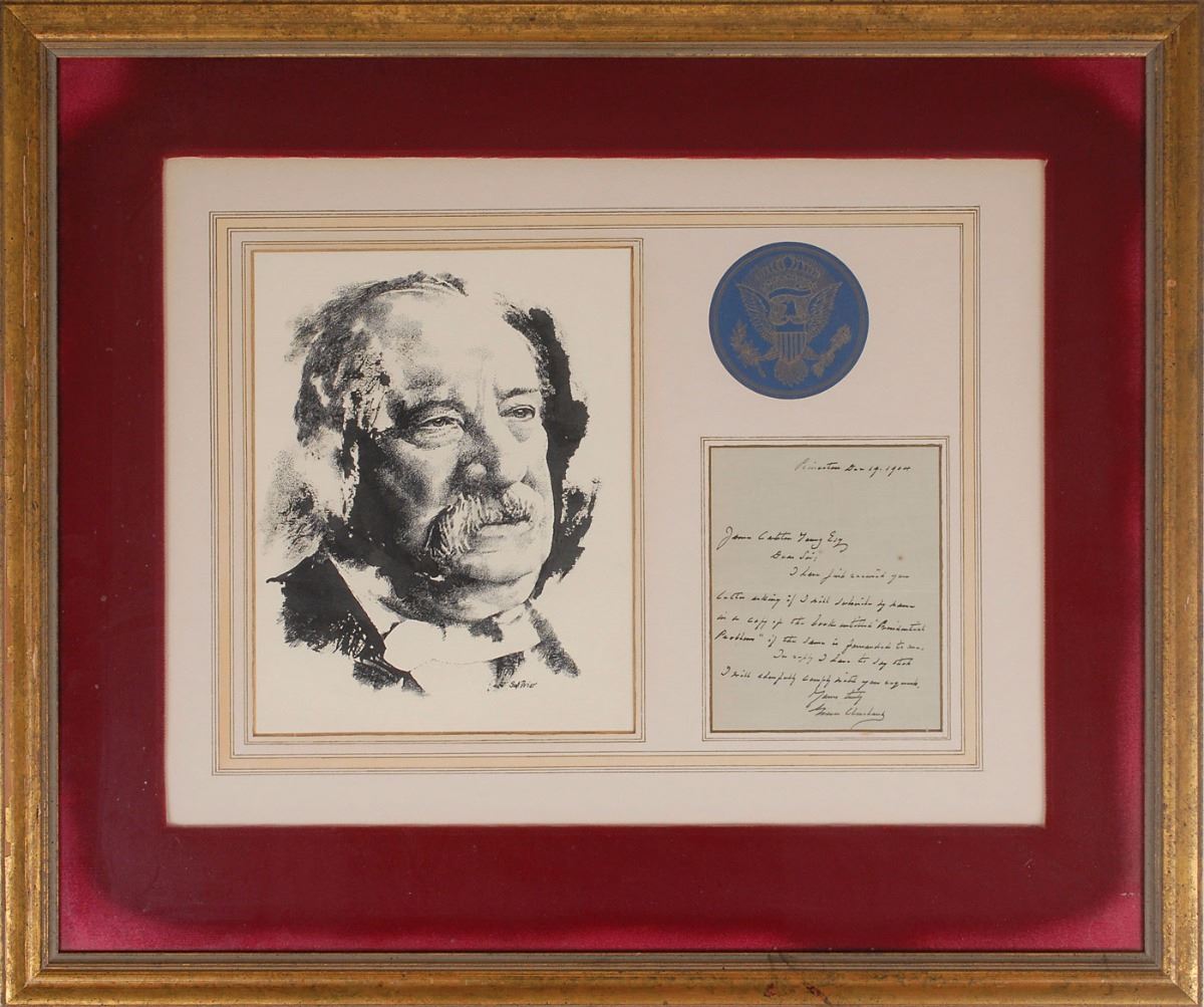 ALS, one page, 5 x 6.5, December 19, 1904. Letter to noted bibliophile James Carleton Young. In full: “I have just received your letter asking if I will subscribe my name in a copy of the book entitled ‘Presidential Problems’ if the same is forwarded to me. In reply I have to say that I will cheerfully comply with your request.” Double-matted and framed with an original pen-and-ink portrait of Cleveland by artist Scott Prior to an overall size of 27 x 23. In fine condition, with a couple spots of foxing.