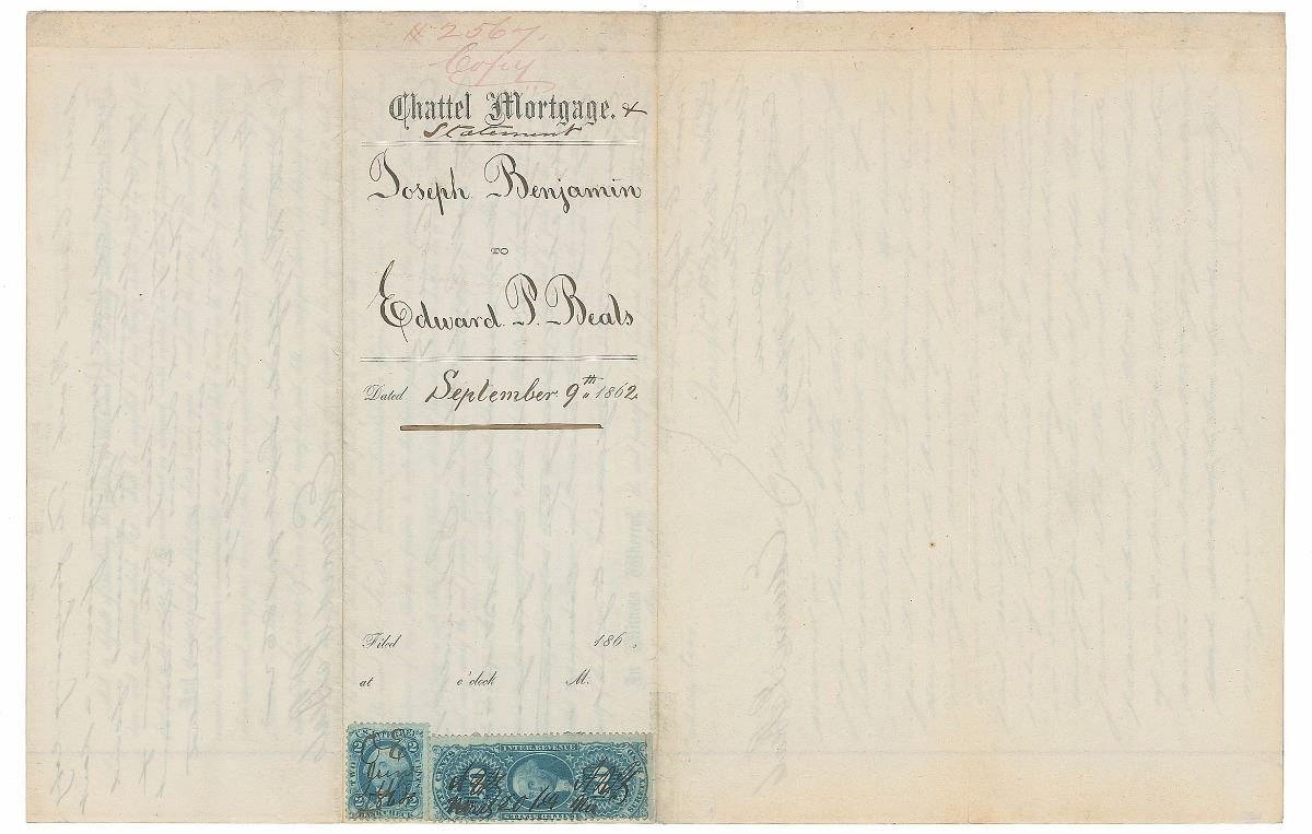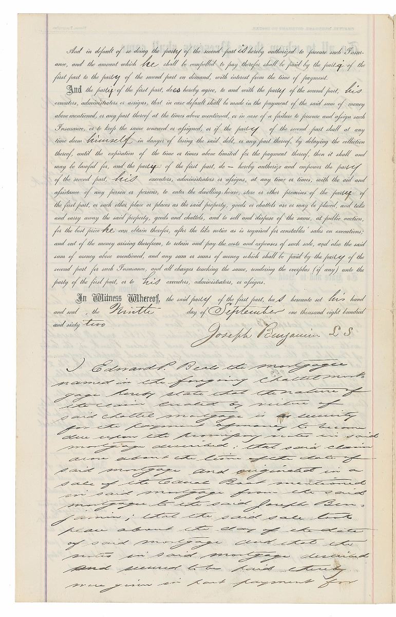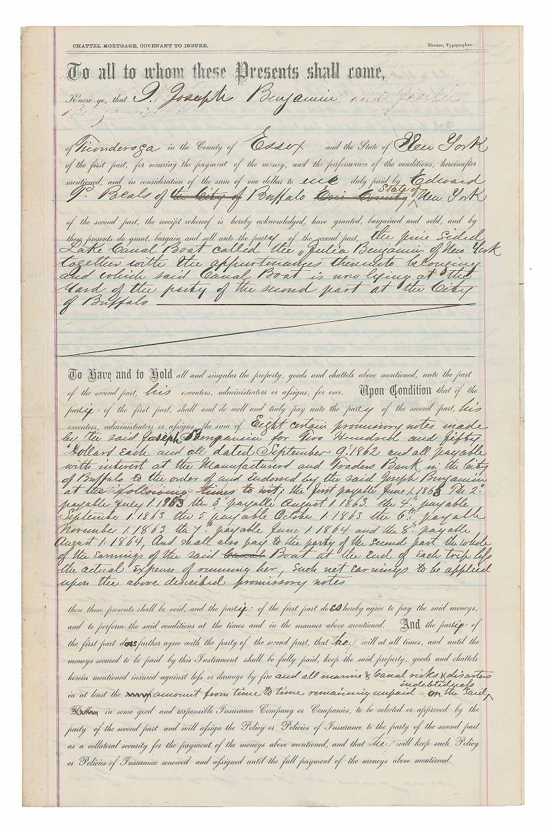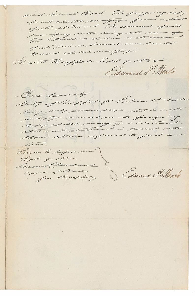 Early ADS signed “Grover Cleveland, Comr. of Deeds for Buffalo,” three pages on two adjoining sheets, 8.25 x 11.75, September 9, 1862. Chattel mortgage agreement between Joseph Benjamin and Edward P. Beals for a “pine sided Lake Canal Boat,” to which Cleveland adds a lengthy statement of approximately two hundred words on the second and third pages. Cleveland writes, in part: “The nature of the claim enacted by virtue said chattel mortgage is as security for the payment of money to become due upon the promissory notes in said mortgage described: that said claim arose about the time of the date of said mortgage and originated in a sale of the Canal Boat mentioned in said mortgage from the said mortgagee to the said Joseph Benjamin…The amount of said promissory notes being the sum of Two Thousand dollars.” Signed at the conclusion by Cleveland. In fine condition, with small and unobtrusive tape-repaired separations to expected storage folds. Just twenty-five years old at the time he penned this document, Cleveland had been admitted to the bar three years earlier. Although the Civil War raged in the South, he avoided conscription by hiring a substitute and was able to dedicate himself to practicing law throughout the 1860s.