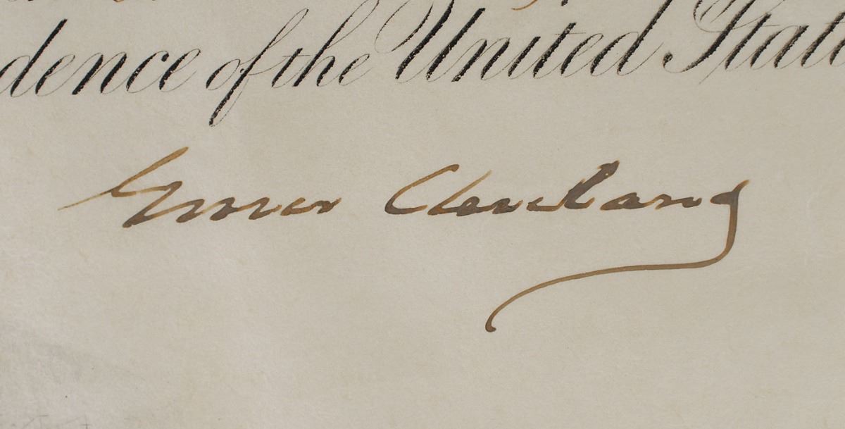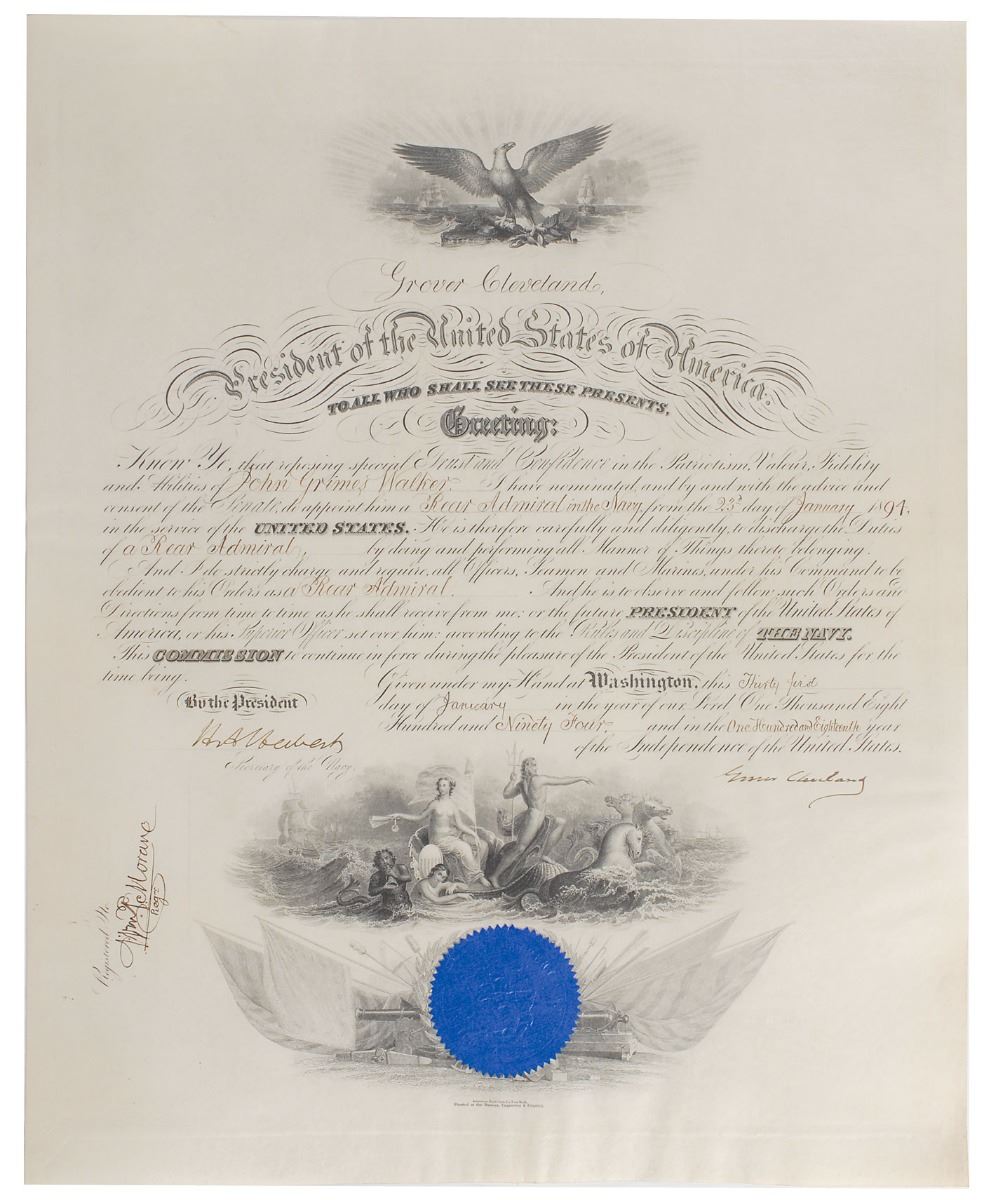 Exquisite partly-printed vellum DS as president, one page, 15.75 x 19.5, January 31, 1894. President Cleveland appoints John Grimes Walker as “a Rear Admiral in the Navy.” Boldly signed at the conclusion by Cleveland and countersigned by Secretary of the Navy Hilary A. Herbert. The blue seal affixed at the bottom remains fully intact. In fine condition. Walker was a significant figure in the American Navy during the last half of the 19th century. After serving with distinction in the Civil War, his positions included assistant superintendent of the Naval Academy, chief of the Bureau of Navigation, head of the Lighthouse Board, and commander-in-chief of the Squadron of Evolution and of the North Atlantic Squadron.