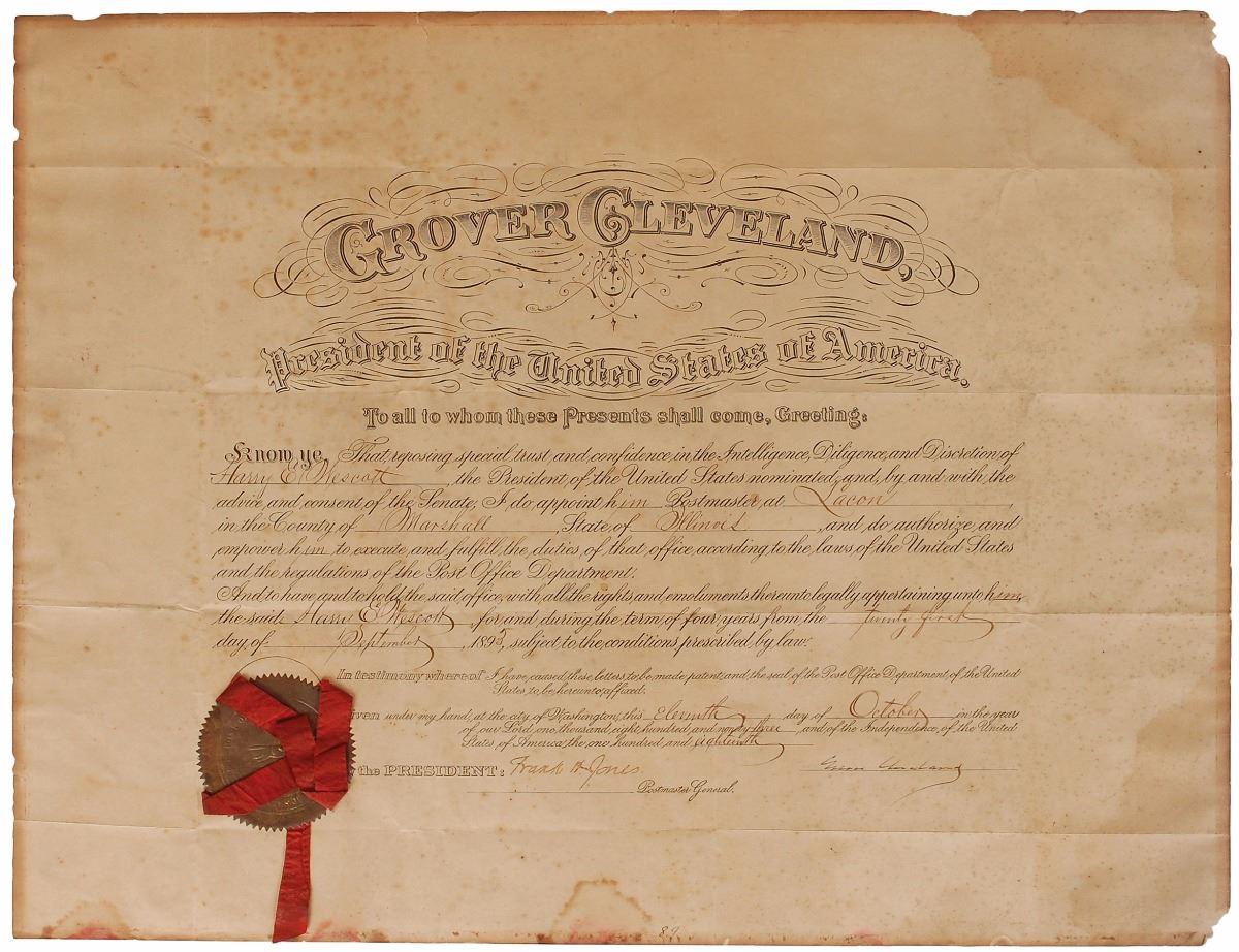 Partly-printed DS as president, one page, 22 x 17, October 11, 1893. President Cleveland appoints Harry E. Westcott as “Postmaster at Lacon in the County of Marshall, State of Illinois.” Signed at the conclusion by President Cleveland and countersigned by Assistant Postmaster General Frank Jones. The seal and ribbon affixed to the lower left remain intact. In very good condition, with intersecting folds, moderate overall foxing, and staining and toning primarily to edges and corners.