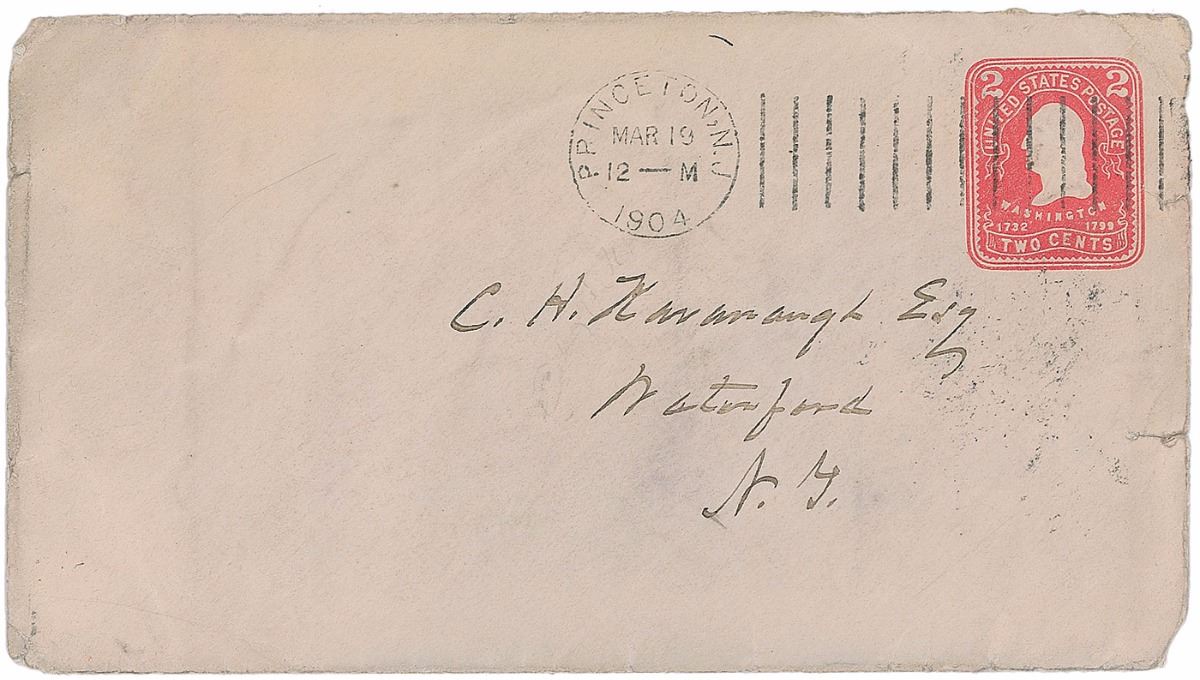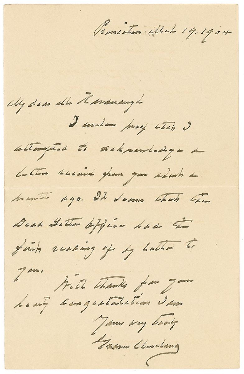 ALS, one page, 4.5 x 7, March 19, 1904. Letter to C. H. Kavanaugh. In full: “I enclose proof that I attempted to acknowledge a letter received from you about a month ago. It seems that the Dead Letter Office had the first reading of my letter to you.” In fine condition. Accompanied by the original mailing envelope, addressed in Cleveland’s hand.