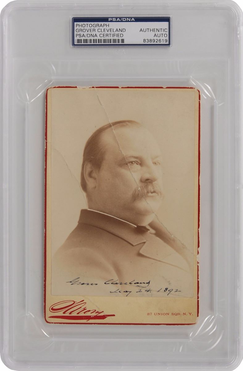 Original 4.25 x 6.5 cabinet photo of Cleveland, signed below in black ink, “Grover Cleveland, May 24, 1892.” Published by the Otto Sarony Studio of New York. Encapsulated in a plastic PSA/DNA authentication holder. In very good condition, with three creases, the heaviest of which passes through Cleveland’s face. Signed between Cleveland’s two nonconsecutive terms as president.