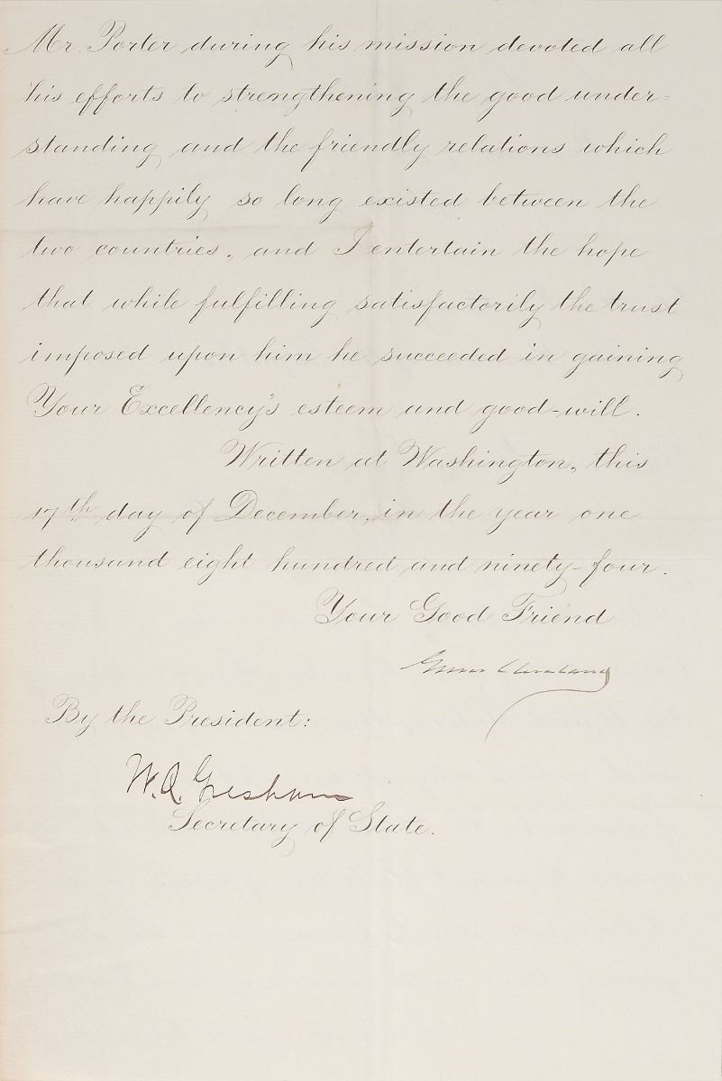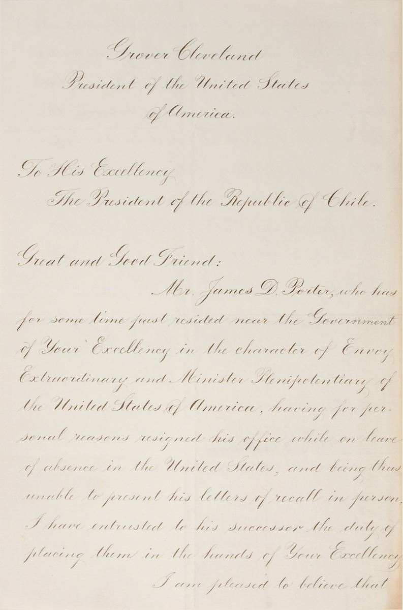 LS as president, one page both sides, 8.25 x 12.25, December 17, 1894. Official letter of state to "His Excellency the President of the Republic of Chile," in part: "Mr. James D. Porter, who has for some time past resided near the Government of Your Excellency in the character of Envoy Extraordinary and Minister Plenipotentiary of the United States of America, having for several reasons resigned his office, and being thus unable to present his letters of recall in person, I have entrusted to his successor the duty of placing them in the hands of Your Excellency." Signed at the conclusion by President Cleveland and countersigned by Secretary of State Walter Q. Gresham. In fine condition, with intersecting folds, and light toning along the right edge of the first page. Pre-certified PSA/DNA.