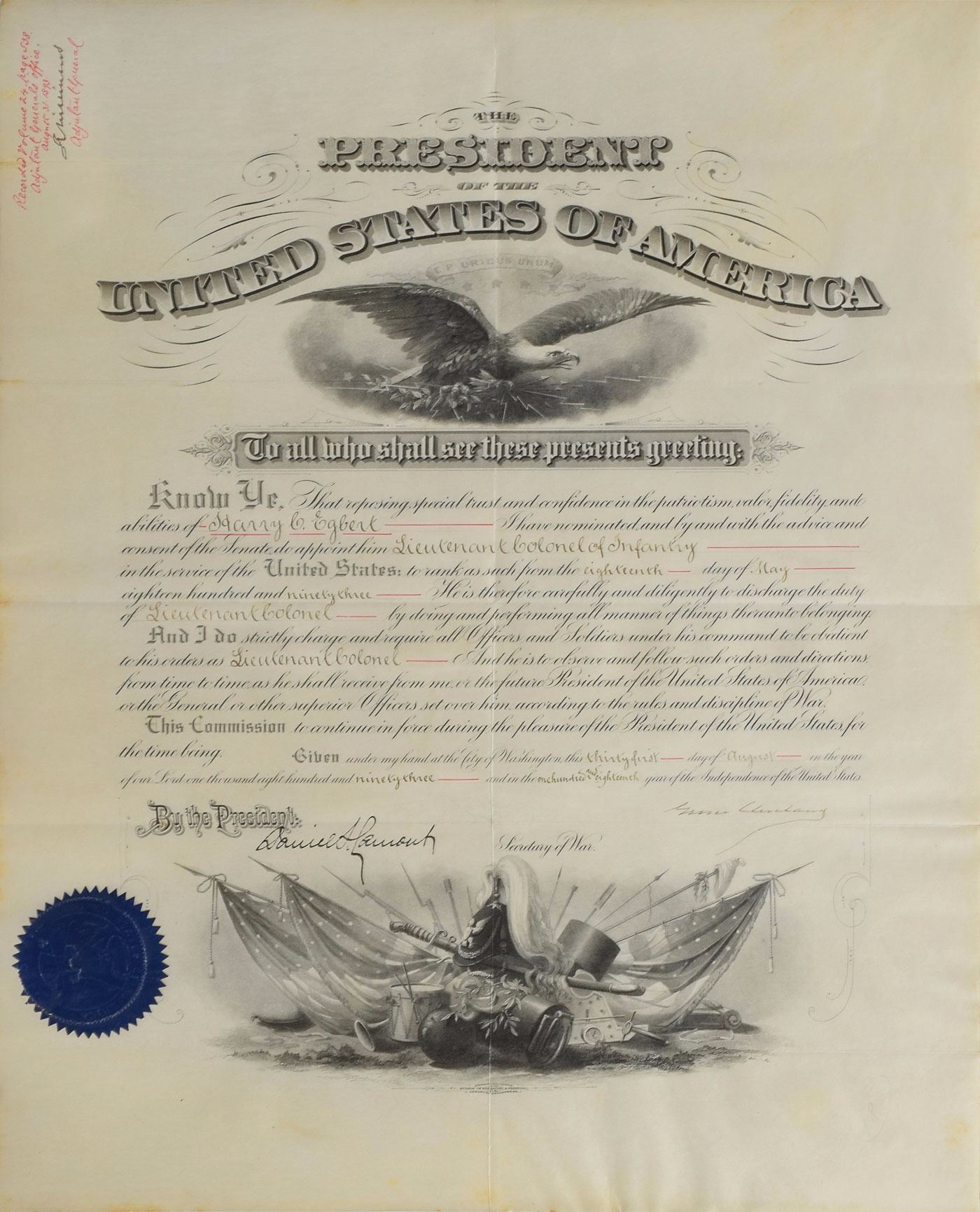 Partly-printed vellum DS as president, one page, 15.75 x 19.5, August 31, 1893. President Cleveland appoints Harry C. Egbert as "Lieutenant Colonel of Infantry in the service of the United States." Signed at the conclusion by Cleveland, and countersigned by Secretary of War Daniel S. Lamont. Dark blue War Office seal remains affixed to lower left. In fine condition. Egbert served as a captain in the Civil War and then became a colonel of the 22nd infantry in Cuba during the Spanish-American War. He attained the rank of brigadier general and, directed to the Philippines, was killed on March 26, 1899.