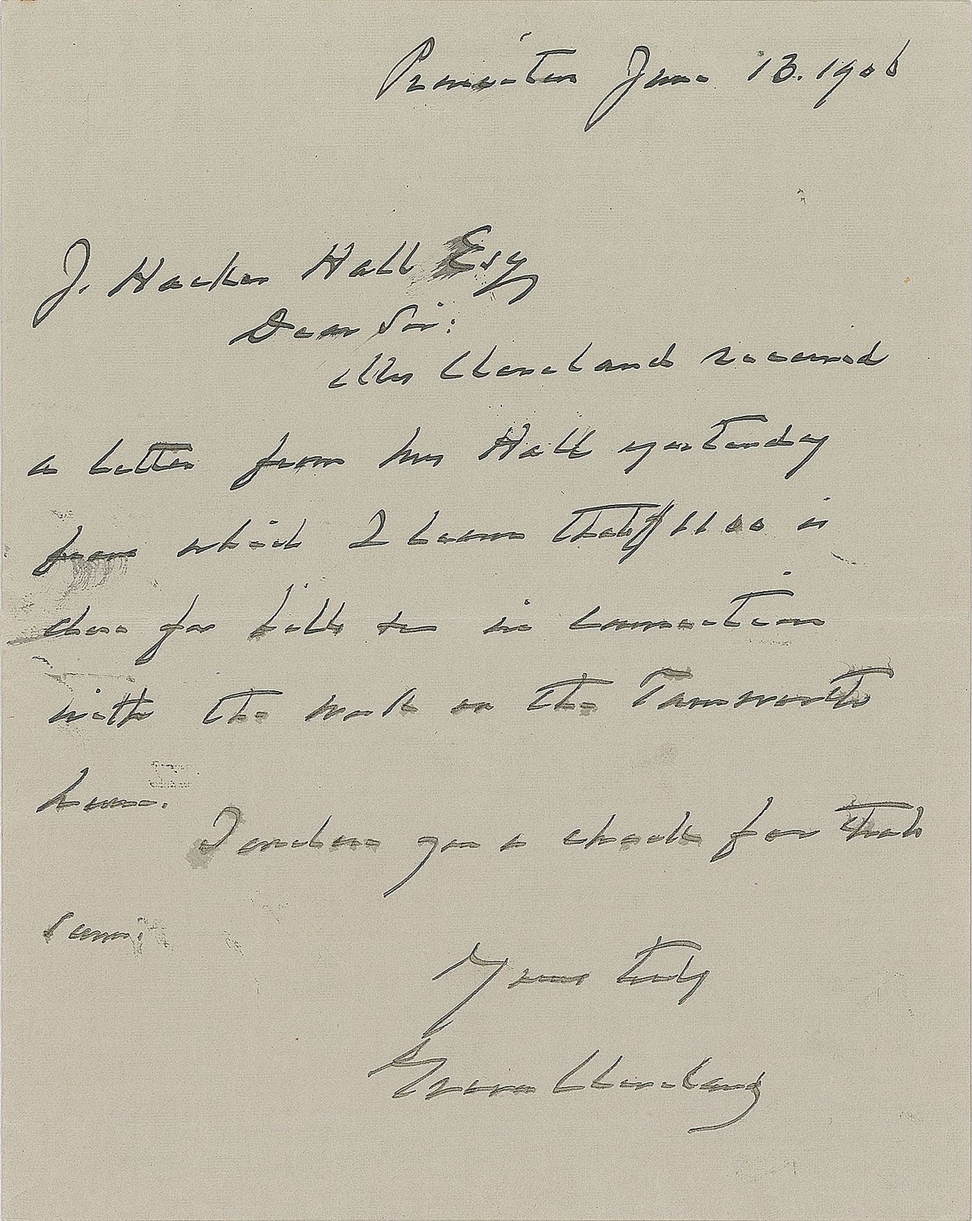 ALS, one page, 5.25 x 6.5, June 13, 1906. Letter to J. Hacker Hall, in part: "Mrs. Cleveland received a letter from Mrs. Hall yesterday from which I learn that $1100 is due for bills etc in connection with…the Tamworth house. I enclose you a check for that sum." In fine condition. Accompanied by the original mailing envelope addressed in Cleveland's own hand.