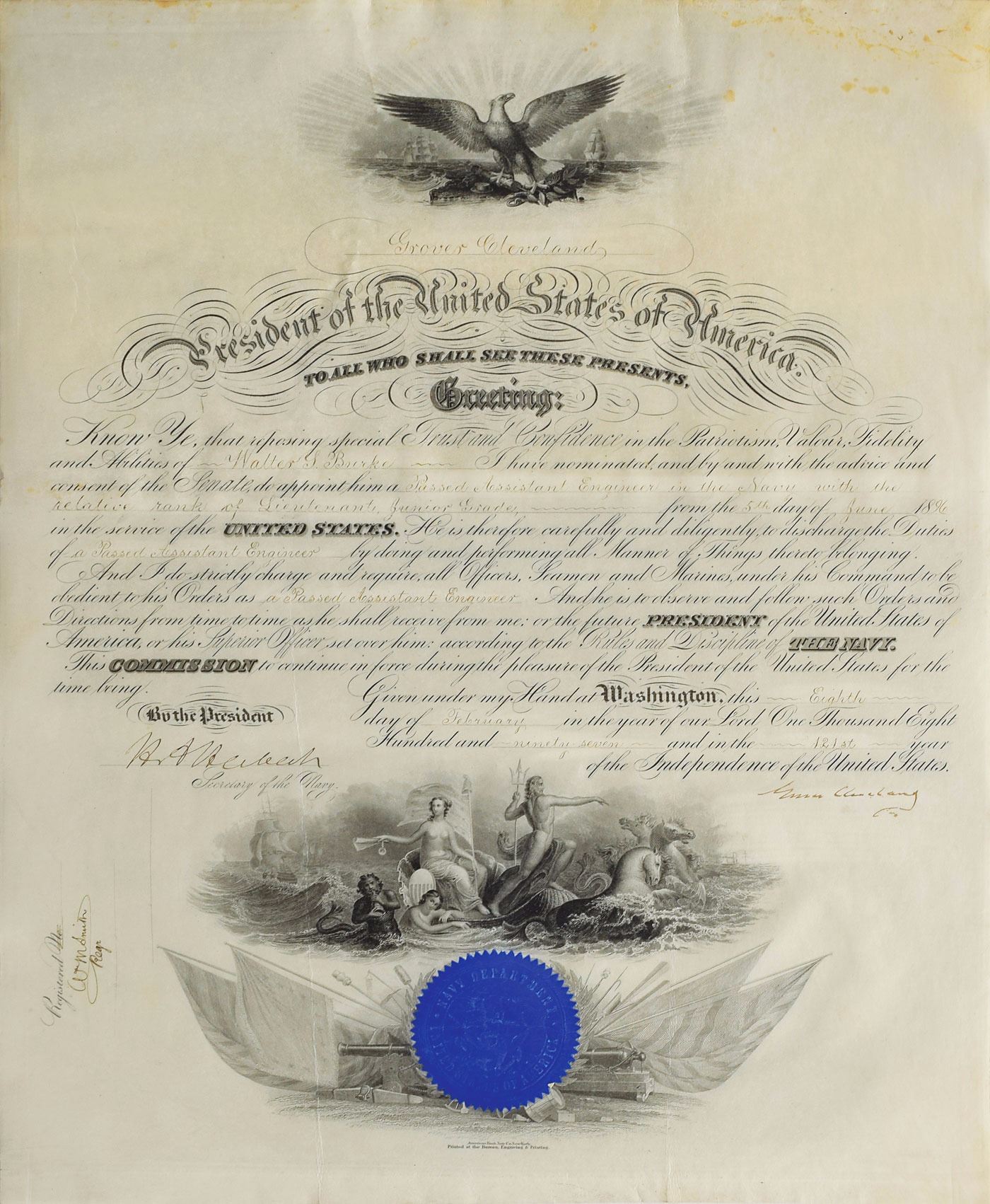 Partly-printed vellum DS as president, one page, 14.5 x 18.5, February 8, 1897. President Cleveland appoints Walter S. Burke as a "Passed Assistant Engineer in the navy with the relative rank of Lieutenant Junior Grade." Signed at the conclusion by Cleveland, and countersigned by Secretary of the Navy Hilary A. Herbert. Blue naval department seal remains affixed to lower vignette. In fine condition, with some light staining to the top edge. Accompanied by a partly-printed vellum United States Naval Academy certificate of graduation for Burke, signed at the bottom by William T. Sampson and several other naval officials. Burke retired from active service the year this document was issued due to the loss of an arm.