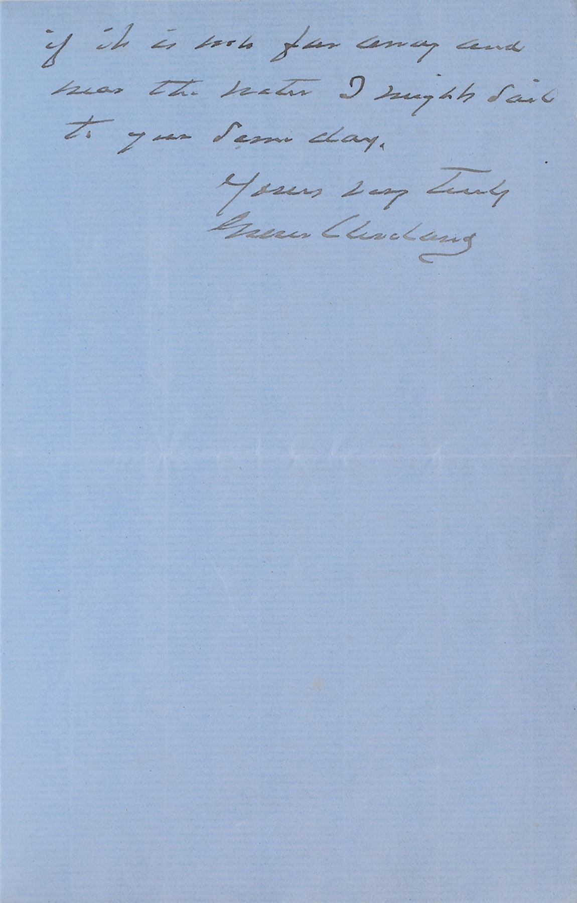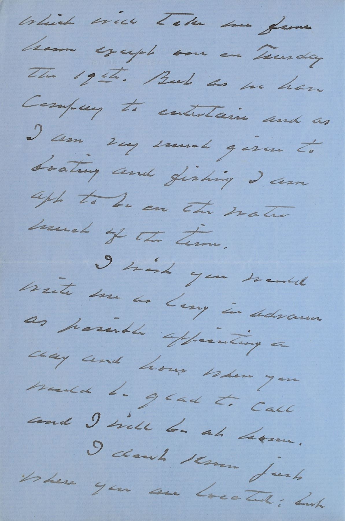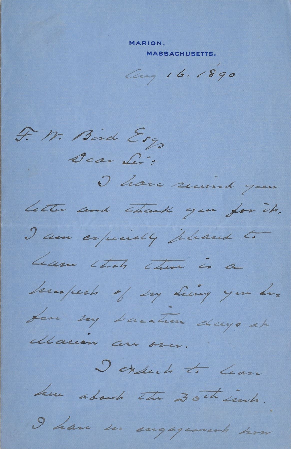 ALS as president, three pages on two adjoining sheets, 4.5 x 7, Marion, Mass. letterhead, August 16, 1890. Letter to F. W. Bird, in part: "I am especially pleased to learn that there is a prospect of my seeing you before my vacation days at Marion are over. I expect to leave here about the 30th inst. I have no engagements now which will take me from here except…on Tuesday the 19th. But as we have company to entertain and as I am very much given to boating and fishing I am apt to be on the water much of the time…I don’t know just where you are located, but if it is not far away and near the water I might sail to you some day." In fine condition.