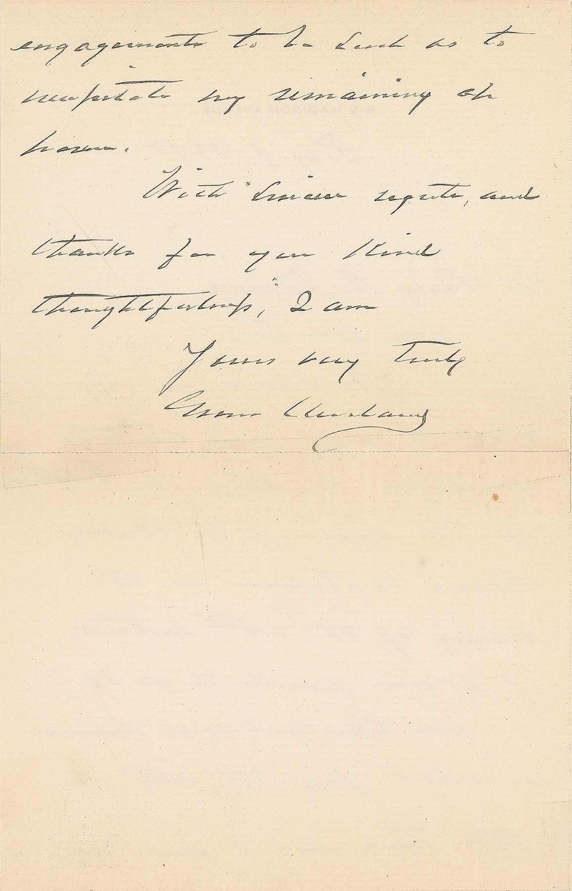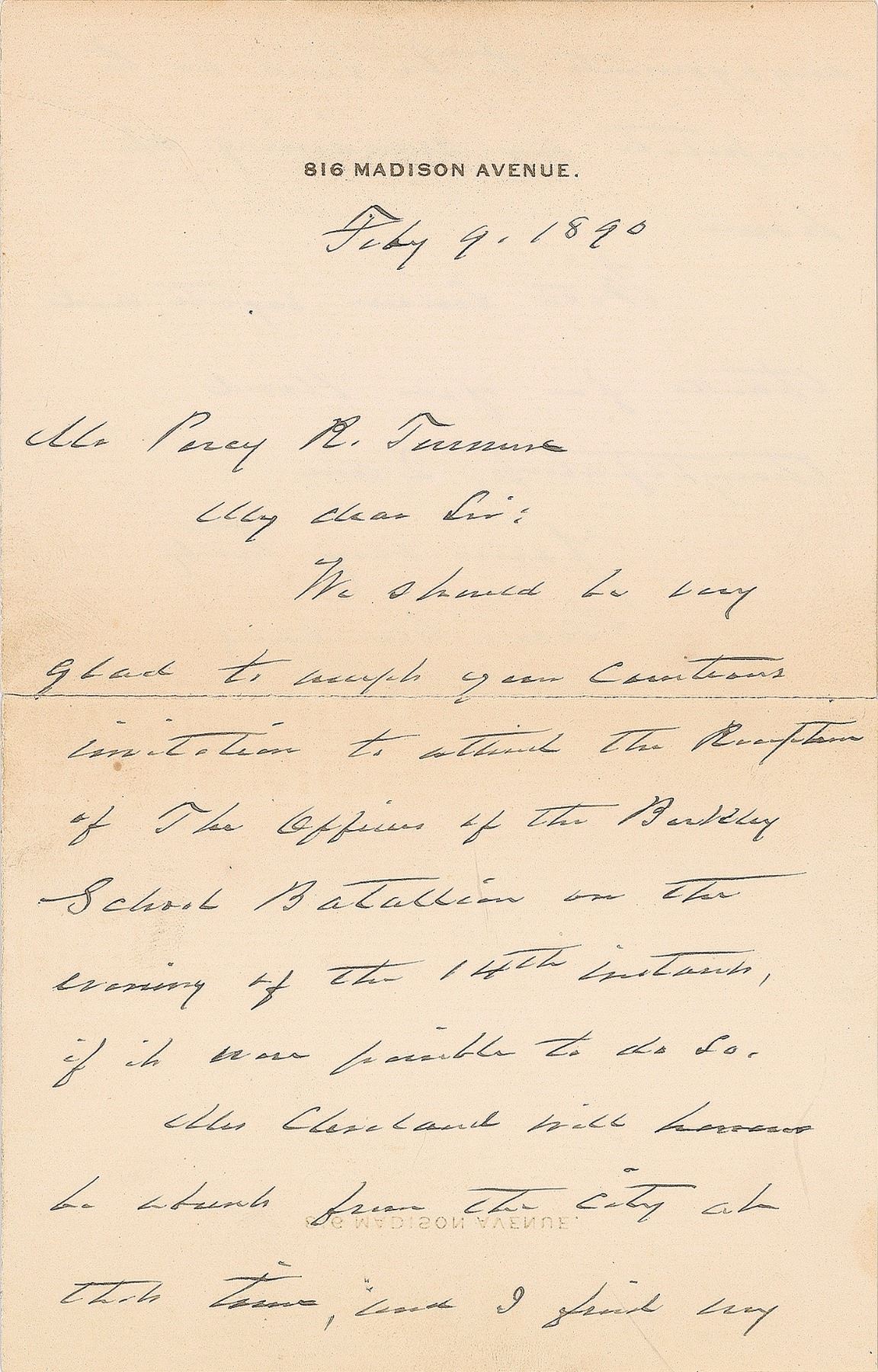 ALS, one page both sides, 4.5 x 7, 816 Madison Avenue letterhead, February 9, 1890. Letter to Percy R. Turner, in part: "We should be very glad to accept your courteous invitation to attend the Reception of The Offices of the Barkley School Battalion on the evening of the 14th instant, if it was possible to do." In fine condition, with repaired separations to the central horizontal fold. Accompanied by the original mailing envelope, addressed in Cleveland's own hand.