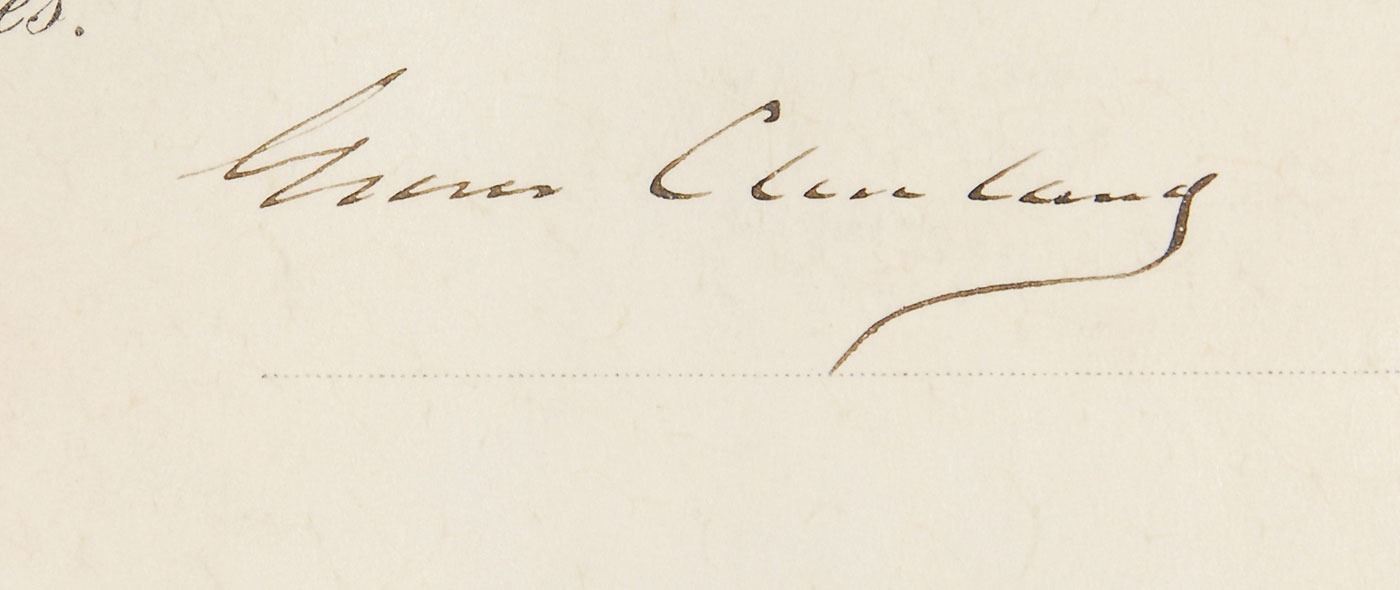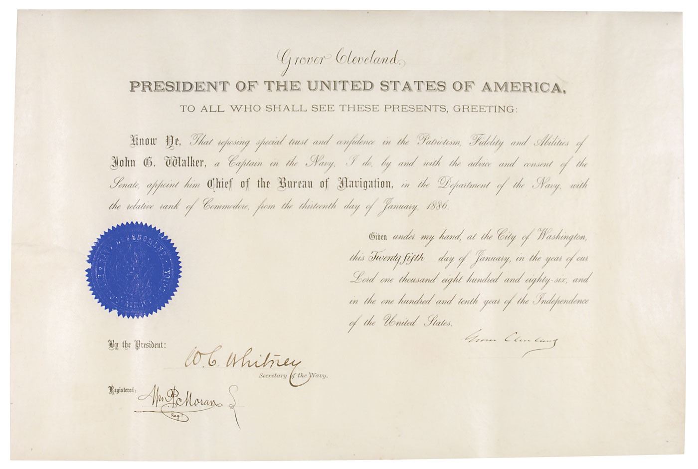 Partly-printed vellum DS as president, one page, 17.75 x 11.75, January 25, 1886. President Cleveland appoints "John G. Walker, a Captain in the Navy...Chief of the Bureau of Navigation." Boldly signed at the conclusion by President Cleveland and countersigned by Secretary of the Navy William Collins Whitney. The blue seal affixed to the left side remains intact with a couple chips to points. In fine condition, with a mild crease to the left side. Walker had served in the Union Navy under David Dixon Porter during the Civil War, participating in the operations which resulted in the fall of New Orleans. He later came under scrutiny while serving as chief of the Bureau of Navigation, when an 1891 New York Times exposé revealed that he was promoting senior officers to positions well beneath their abilities; in doing so, Walker hoped they would retire out of boredom and thereby increase his own seniority. Despite these allegations, he was eventually promoted to rear admiral. An uncommonly bright and boldly signed military commission from Cleveland's first term.