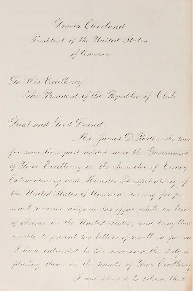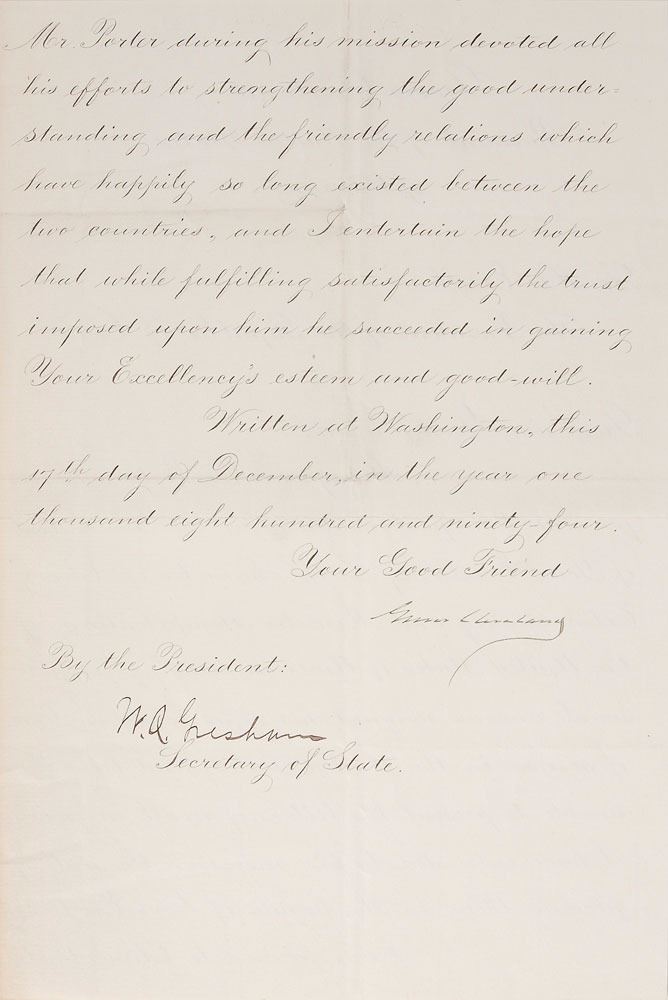 LS as president, one page both sides, 8.25 x 12.25, December 17, 1894. Official letter of state to "His Excellency the President of the Republic of Chile," in part: "Mr. James D. Porter, who has for some time past resided near the Government of Your Excellency in the character of Envoy Extraordinary and Minister Plenipotentiary of the United States of America, having for several reasons resigned his office, and being thus unable to present his letters of recall in person, I have entrusted to his successor the duty of placing them in the hands of Your Excellency." Signed at the conclusion by President Cleveland and countersigned by Secretary of State Walter Q. Gresham. In fine condition, with intersecting folds, and light toning along the right edge of the first page.