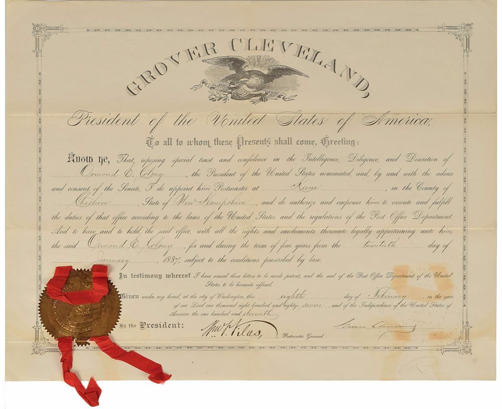 Partly-printed DS as president, one page, 17 x 14, February 8, 1887. President Cleveland appoints Ormond E. Colony as "Postmaster at Keene." Signed at the conclusion by President Cleveland and countersigned by Postmaster General William F. Vilas. The gold seal and red ribbon affixed to the lower left remain intact. In fine condition, with light offset staining in the signature area from the seal and ribbon.