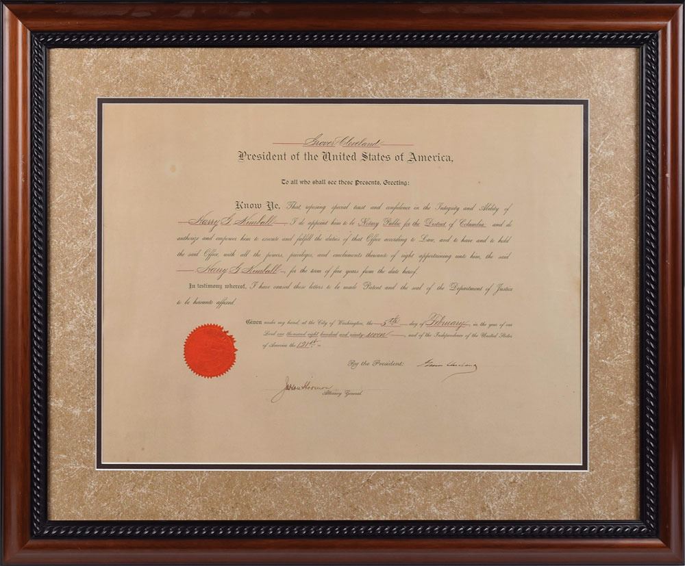 Partly-printed DS as president, one page, 20 x 15, February 5, 1897. President Cleveland appoints Harry G. Kimball as "Notary Public for the District of Columbia." Signed at the conclusion by Cleveland, and countersigned by Attorney General Judson Harmon. Department of Justice seal remains affixed to lower left. Double-matted and framed to an overall size of 28.75 x 23.5. In fine condition.