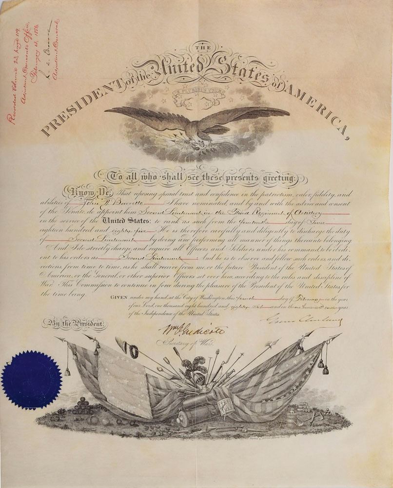 Partly-printed vellum DS as president, one page, 15.5 x 19.5, February 4, 1886. President Cleveland appoints John D. Barrette as "Second Lieutenant in the Third Regiment of Artillery in the service of the United States." Signed at the conclusion by Cleveland, and countersigned by Secretary of War William C. Endicott. Dark blue War Office seal remains affixed to lower left. In fine condition.
