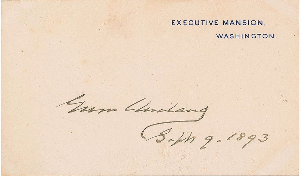 Executive Mansion card signed in fountain pen as president, "Grover Cleveland, Sept. 9, 1893." In fine condition, with some light soiling. Notably, on this day, First Lady Frances Cleveland gave birth to their daughter Esther in the White House—the only child of a president to be born there.