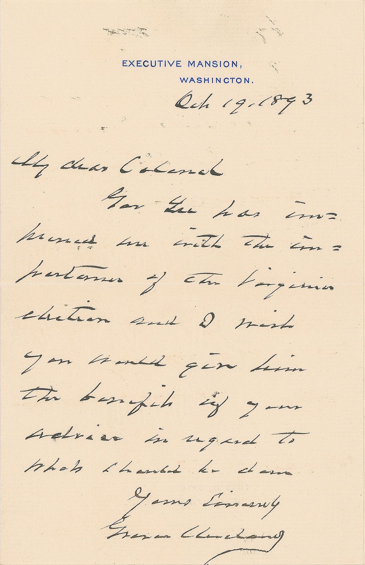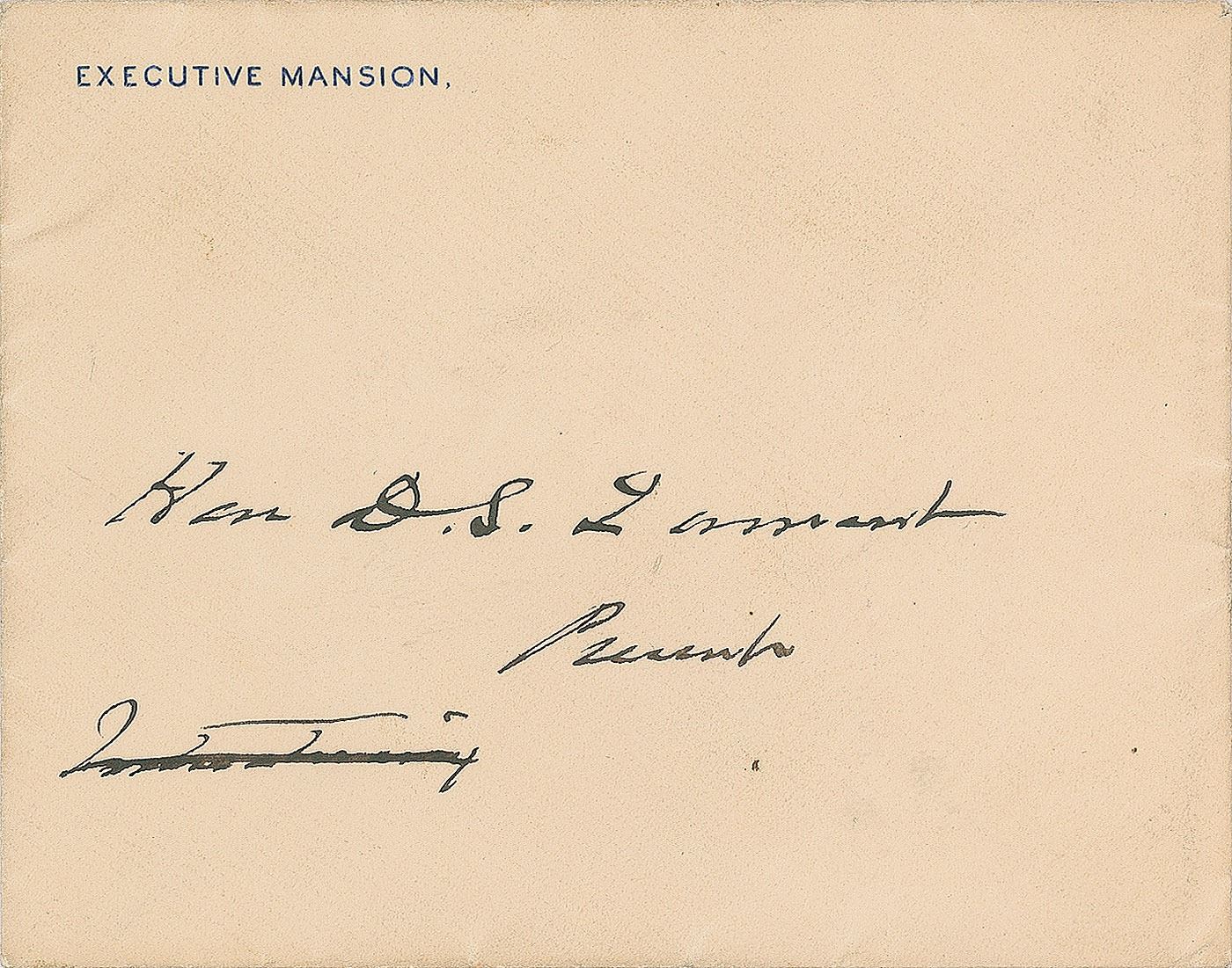 ALS as president, one page, 4.5 x 7, Executive Mansion letterhead, October 19, 1893. Letter to Secretary of War Daniel S. Lamont, in part: "Gov. Lee has impressed me with the importance of the Virginia election and I wish you would give him the benefit of your advice." In fine condition. Accompanied by the original Executive Mansion envelope, which has been annotated in the president's hand.