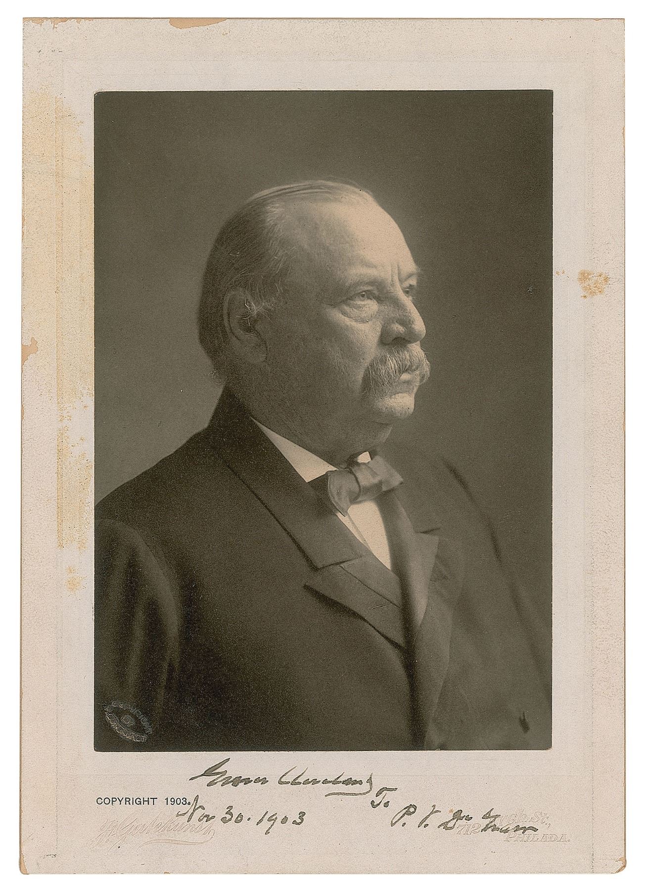 Uncommon 5 x 7.75 cabinet portrait of the former two-time American president, signed and inscribed in the lower border in black ink, "Grover Cleveland, Nov. 30, 1903." Published by the Frederick Gutekunst studio of Philadelphia. In very good to fine condition, with some light staining, and minor surface loss, to the borders.
