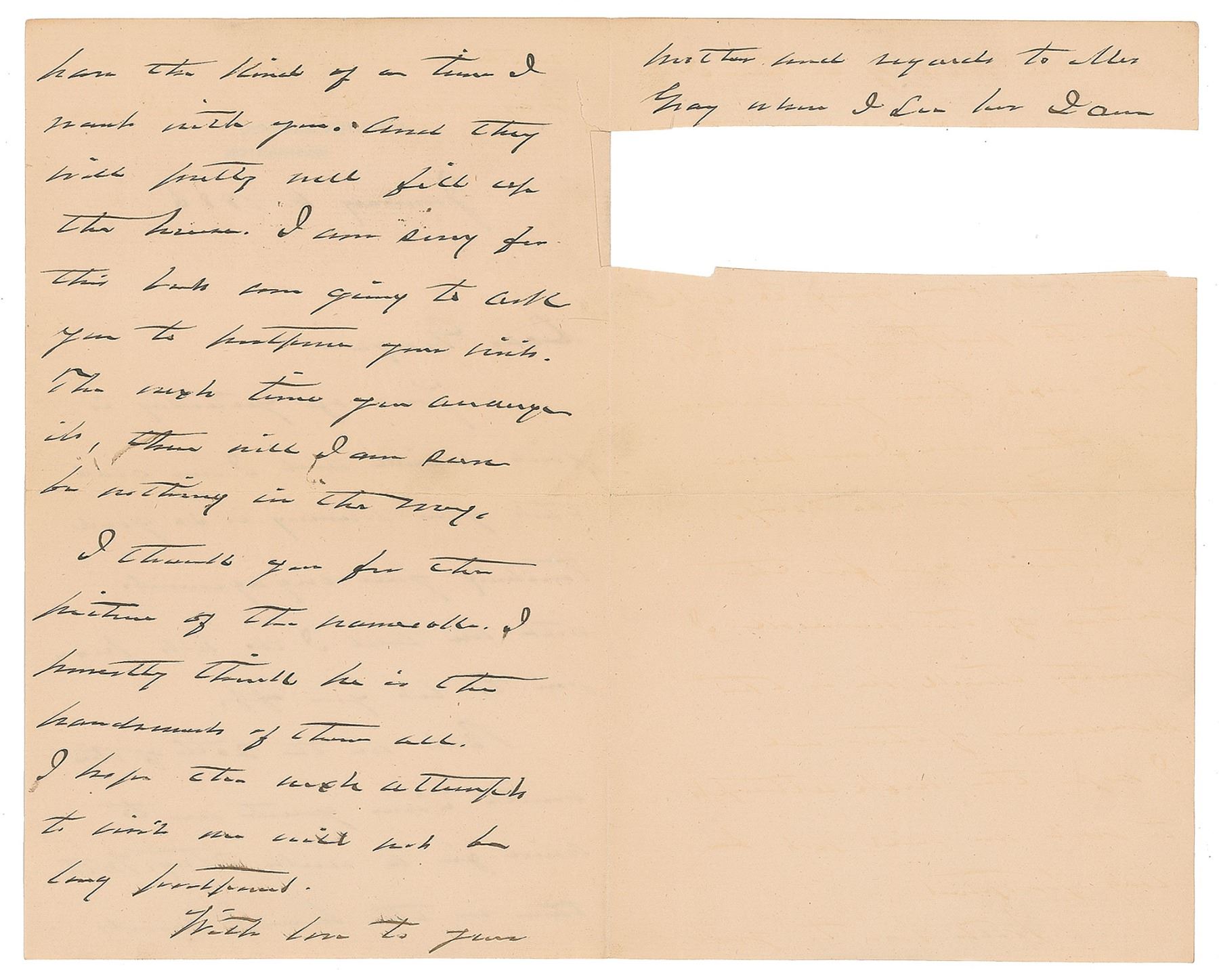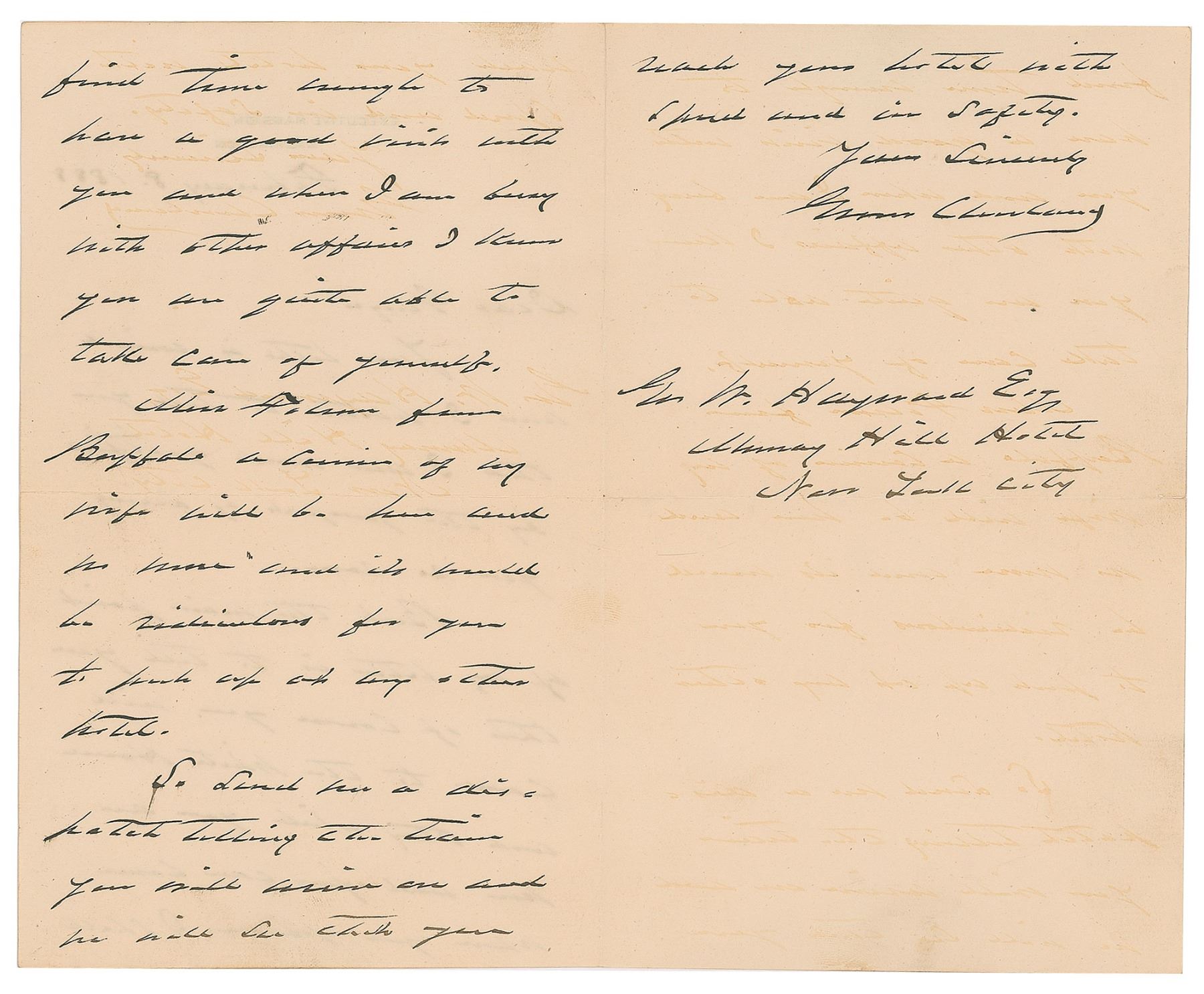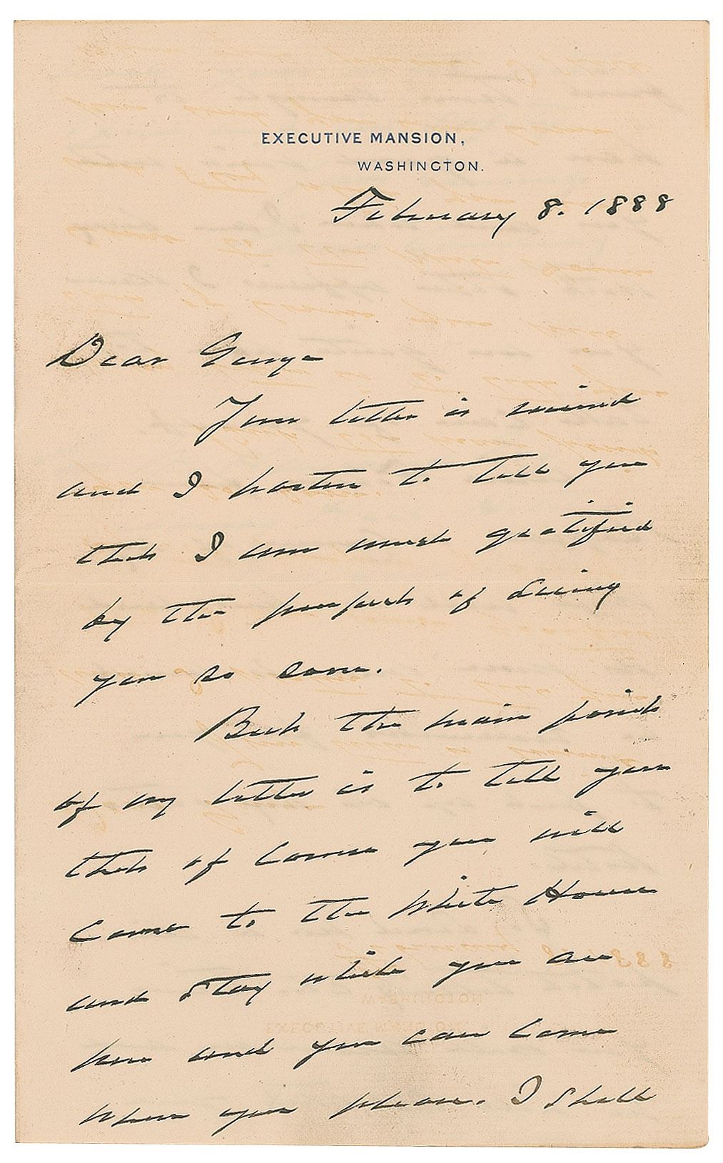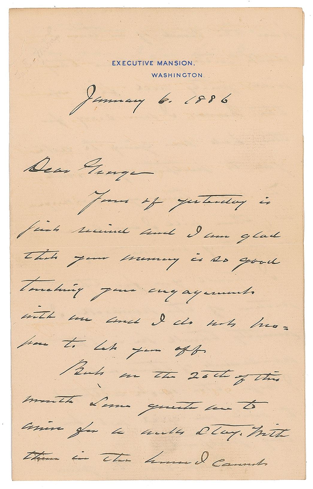 Two handwritten letters from President Grover Cleveland, six total pages, 5 x 8, Executive Mansion letterhead, both addressed to George W. Hayward, a grocer and selectman from Buffalo, New York. The earlier letter, dated January 6, 1886, finds Cleveland requesting that they postpone a meeting, noting that the "next time you arrange it, there will I am sure be nothing in the way," with the signature clipped from the close of the letter. The second letter, dated February 8, 1888, signed at the conclusion by Cleveland, who writes, in part: "The main point of my letter is to tell you that of course you will come to the White House and stay while you are here and you can come when you please. I shall find time enough to have a good visit with you and when I am busy with other affairs I know you are quite able to take care of yourself." In overall very good to fine condition, with the referenced clipped signature from the earlier letter. Accompanied by the original mailing envelopes, both addressed in Cleveland's own hand.