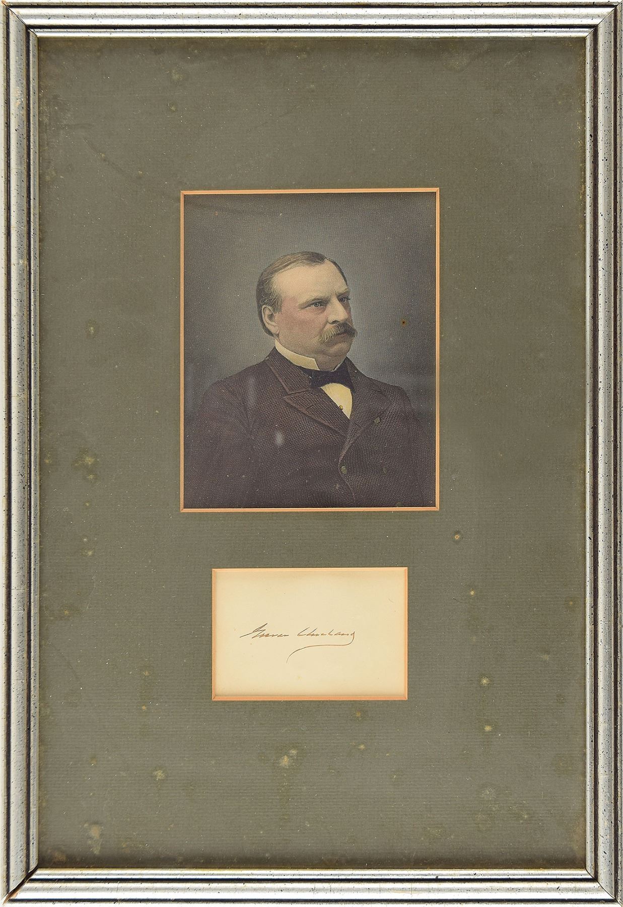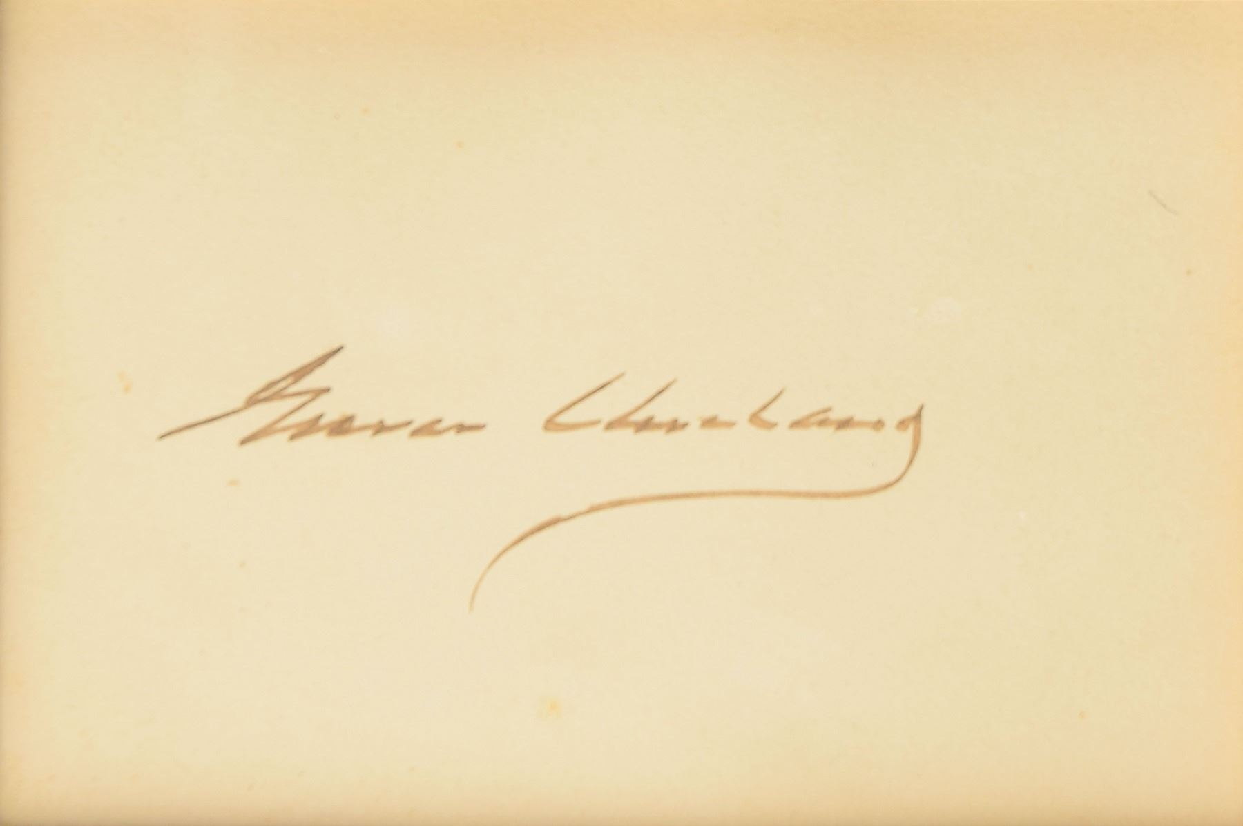 Ink signature, "Grover Cleveland,” on an off-white 3 x 2 card, nicely matted and framed with an engraved portrait to an overall size of 9.75 x 14.25. In fine condition.