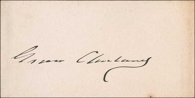 Ink signature, “Grover Cleveland,” on an off-white 4 x 2 card. In fine condition, with mild edge toning. Pre-certified John Reznikoff/PSA/DNA and RRAuction COA.