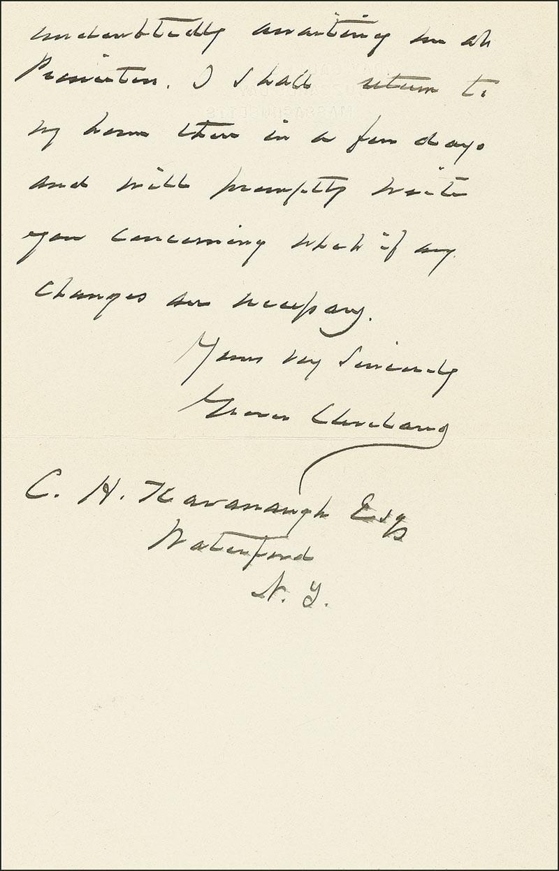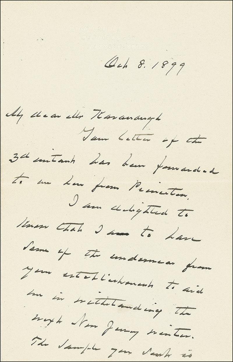 ALS, one page both sides, 4.5 x 7, Gray Gables letterhead, October 8, 1899. Letter of thanks to C. H. Kavanaugh. In part: “I am delighted to know that I am to have some of the underwear from your establishment to aid me in withstanding the next New Jersey winter. The sample you sent is undoubtedly awaiting me at Princeton. I shall return to my home in a few days and will promptly write you concerning what if any changes are necessary.” Accompanied by the original mailing envelope, addressed in Cleveland’s hand. In fine condition. Pre-certified John Reznikoff/PSA/DNA and RRAuction COA.