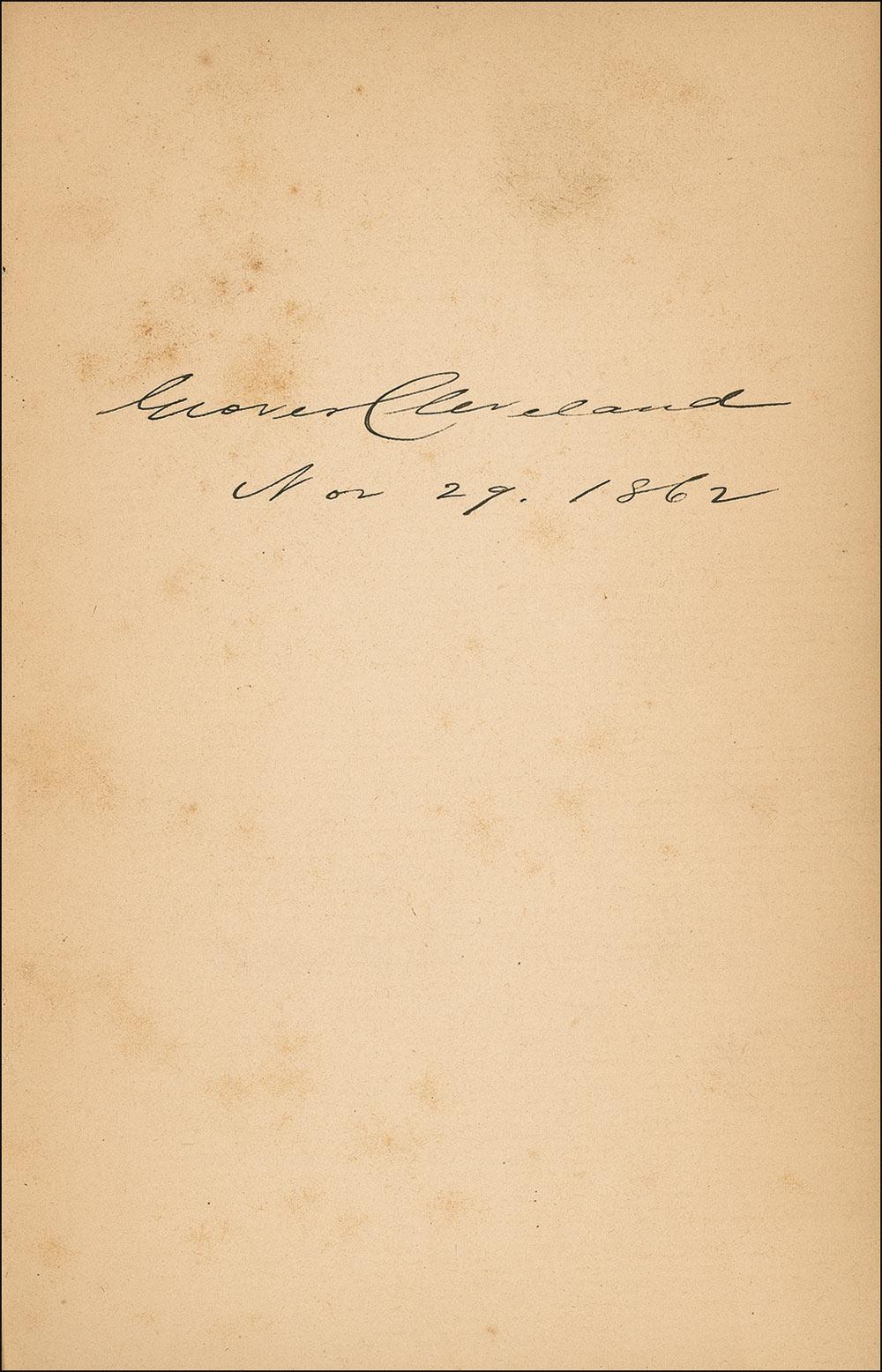 Signed book: The Works of Edgar Allan Poe, Vol III (part of a onetime four volume set; other volumes not present). Library edition. NY: W. J. Middleton, 1861. Hardcover, 5.5 x 8, 607 pages. The second free end page bear Cleveland’s ownership signature, “Grover Cleveland, Nov. 29, 1862.” Opening pages separated from binding (but still attached), loose and fragile spine and binding, light toning and foxing to signed page, partially separated front hinge, spotting and wear to cover, and moderate soiling and small tear to spine, otherwise very good condition. Pre-certified John Reznikoff/PSA/DNA and RRAuction COA.