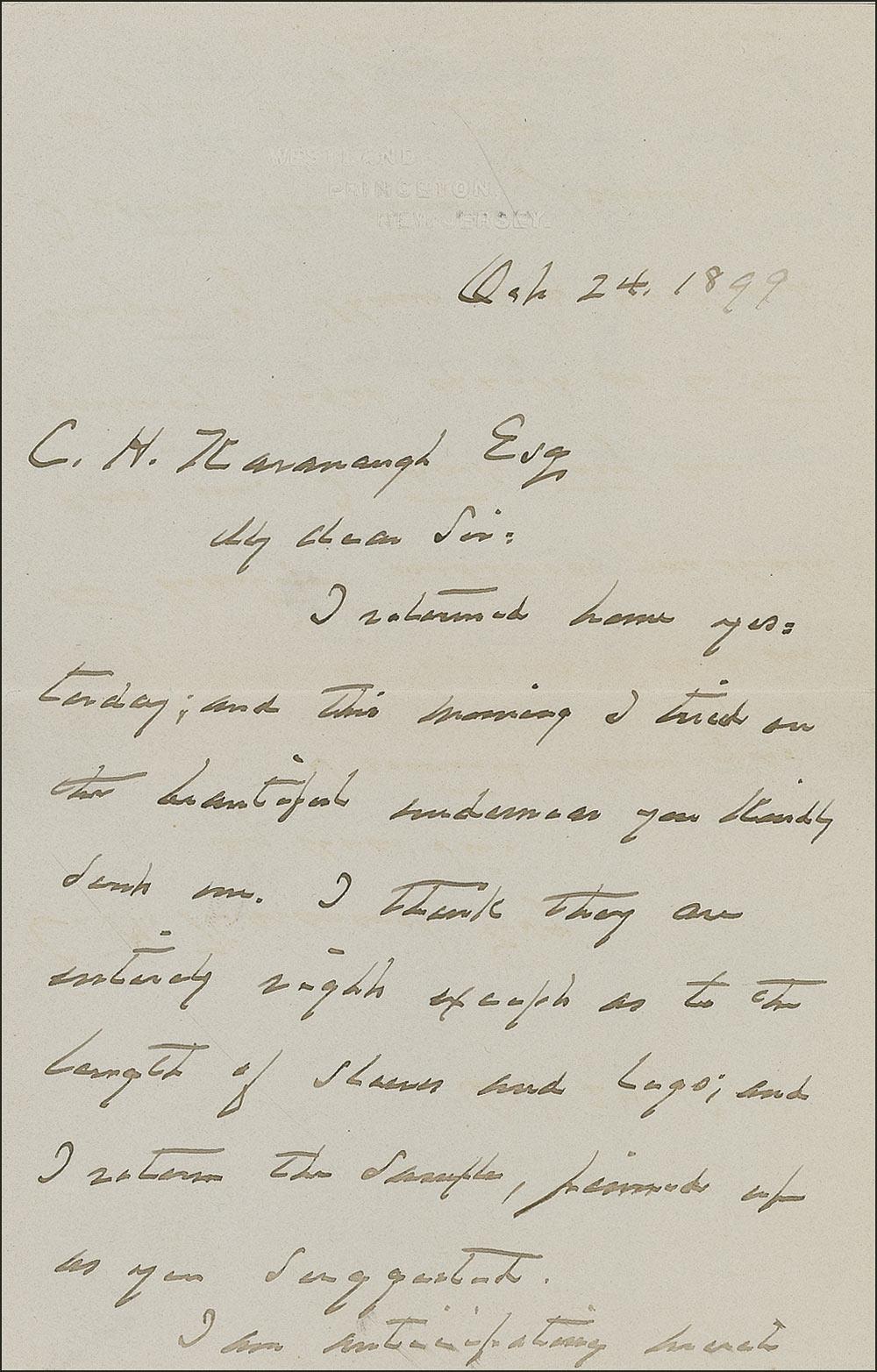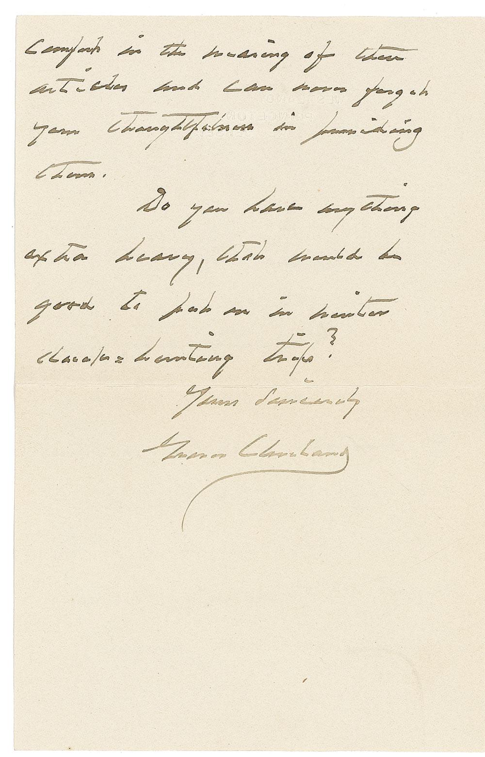ALS, one page both sides, 4.5 x 7, Westland letterhead, October 24, 1899. Letter of thanks to C. H. Kavanaugh. In part: “I tried on the beautiful underwear you kindly sent me. I think they are entirely right except as to the length of sleeves and legs…Do you have anything extra heavy, that would be good to put on in winter…hunting trips?” In fine condition. Accompanied by the original mailing envelope, addressed in Cleveland’s hand. Pre-certified John Reznikoff/PSA/DNA and RRAuction COA.