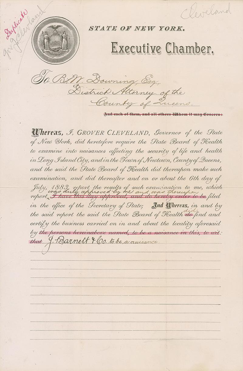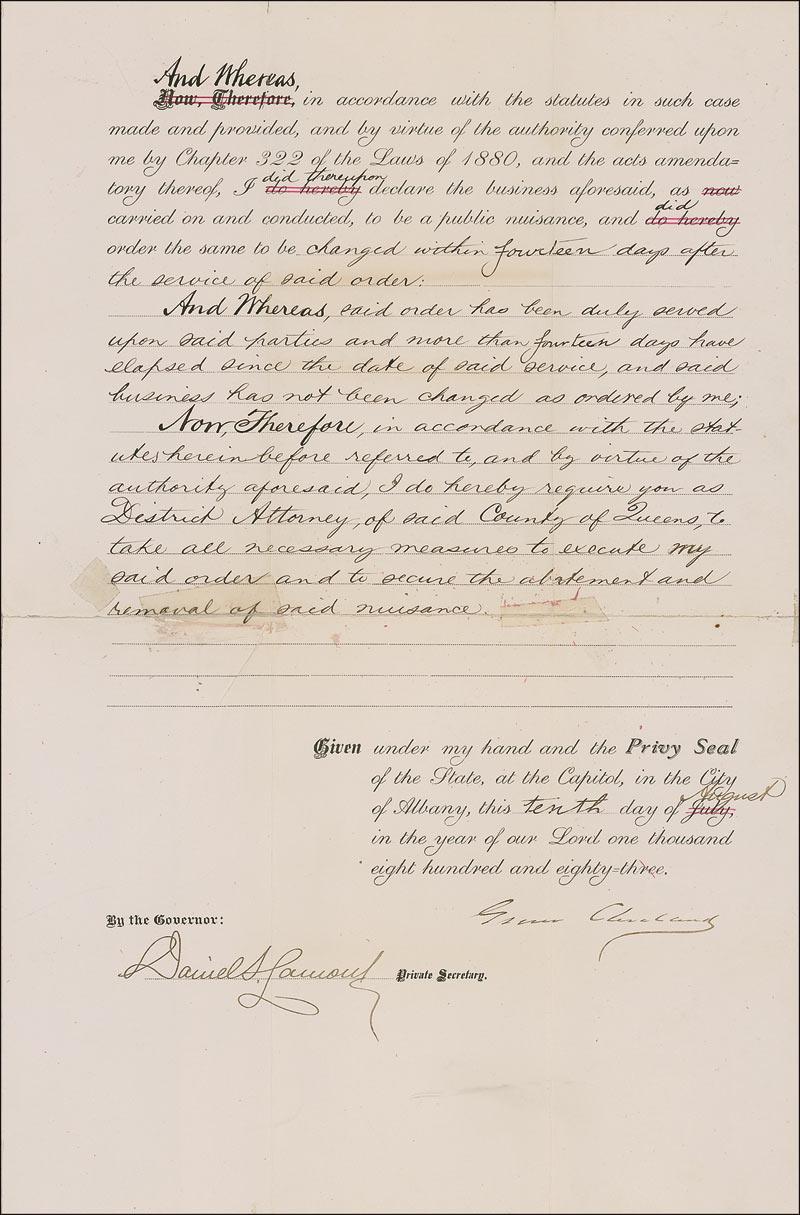 DS, two pages on two adjoining sheets, 10.5 x 16, August 10, 1883. Governor Cleveland instructs the District Attorney of the County of Queens to take all necessary actions “to secure the abatement and removal of said nuisance” caused by a business owned by J. Barnett and Company. Signed on the second page by Cleveland. Previous intersecting storage folds, one through a single letter of signature, a couple repairs to fold separations, as well as a couple of other separations, and some scattered light toning and soiling, otherwise fine condition. Pre-certified John Reznikoff/PSA/DNA and RRAuction COA.