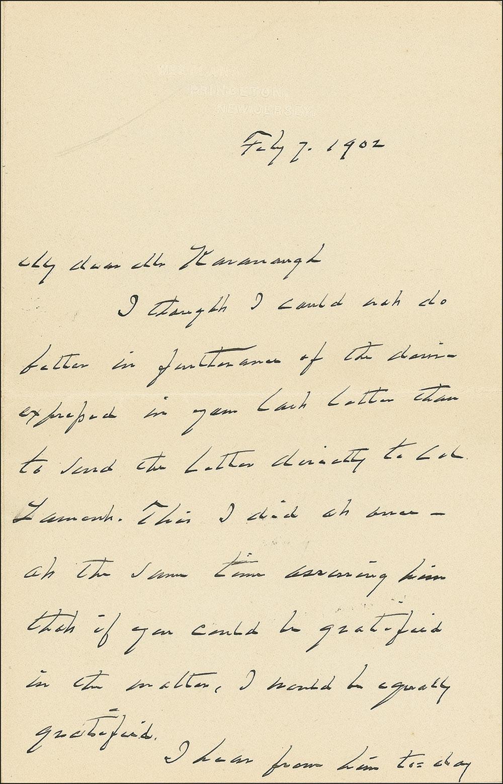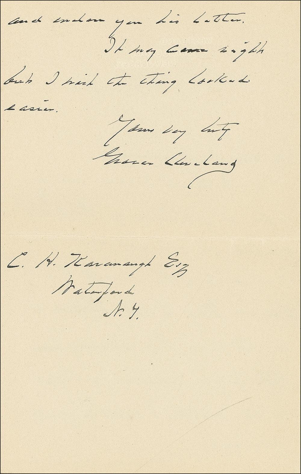 ALS, one page both sides, 4.5 x 7, personal letterhead, February 7, 1902. Letter to C. H. Kavanaugh. In part: “I thought I could not do better in furtherance of the claim expressed in your last letter than to send the letter directly to Col. Lamont. This I did at once—at the same time assuring him that if you could be gratified in the matter, I would be equally gratified.” In fine condition. Accompanied by the original mailing envelope addressed in Cleveland’s hand. Pre-certified John Reznikoff/PSA/DNA and RRAuction COA.