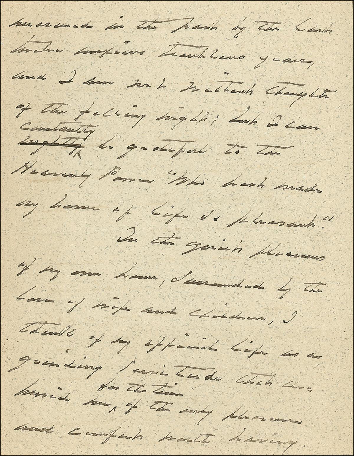 I do not know how it is but these lines and such as they are, seem to touch me much more directly than they used to do. My life seems to be measured in the past by the last twelve anxious troublous years, and I am not without thoughts of the falling night; but I can constantly be grateful to the Heavenly Power ‘Who hath made my house of life so pleasant.’ In the garish pleasures of my own home, surrounded by the love of wife and children I think of my official life as a grinding servitude that deprived me for the time of the only pleasure and comfort worth having.