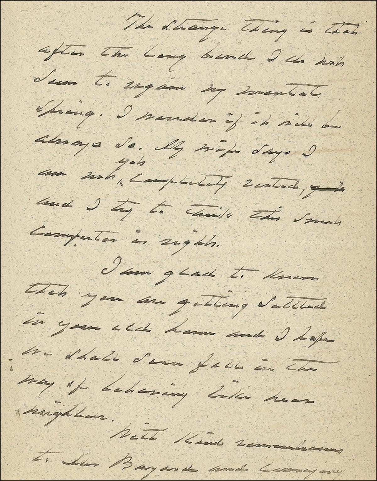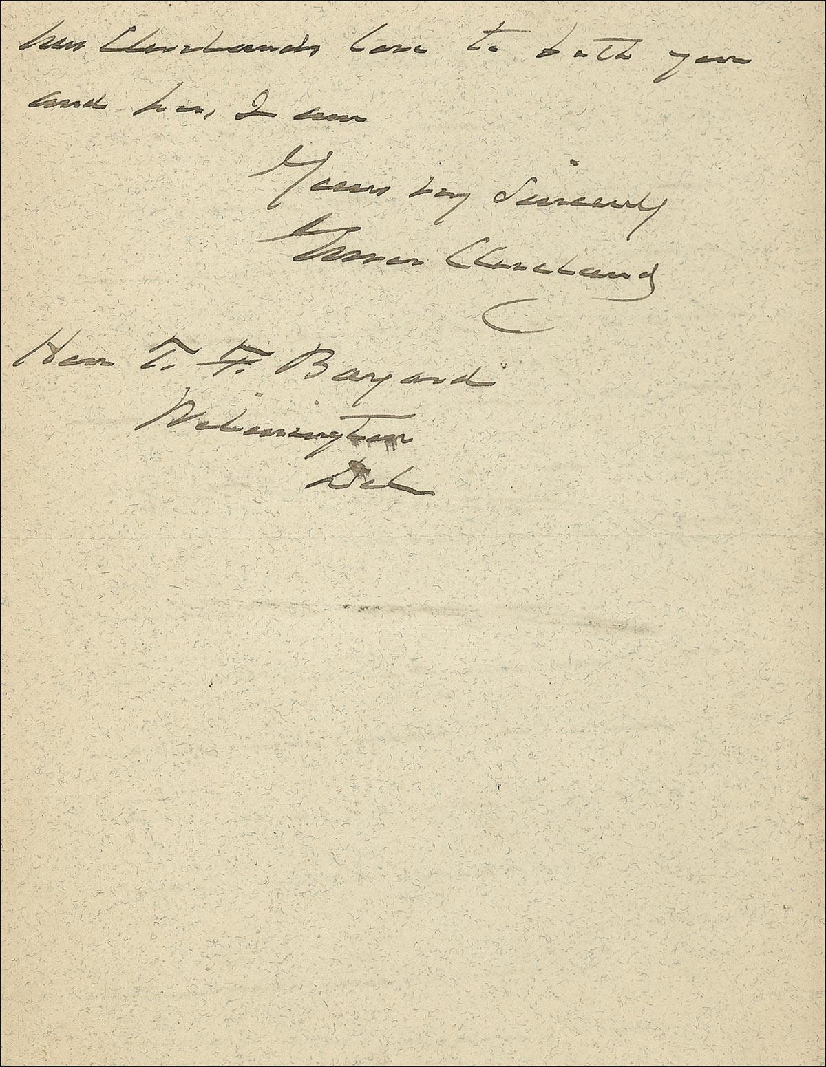 The strange thing is that after the long bind I do not seem to regain my mental spring. I wonder if it will be always so. My wife says I am not yet completely rested, and I try to think this sweet comforter is right. I am glad to know that you are getting settled in your old home and I hope we shall soon fall in the way of behaving like near neighbors. With kind remembrances to Mrs. Bayard and conveying Mrs. Cleveland love to both you and her.” Letter is archivally sleeved in acid-free Mylar. In fine condition, with a hint of extremely mild edge toning and a light fingerprint smudge to first page.