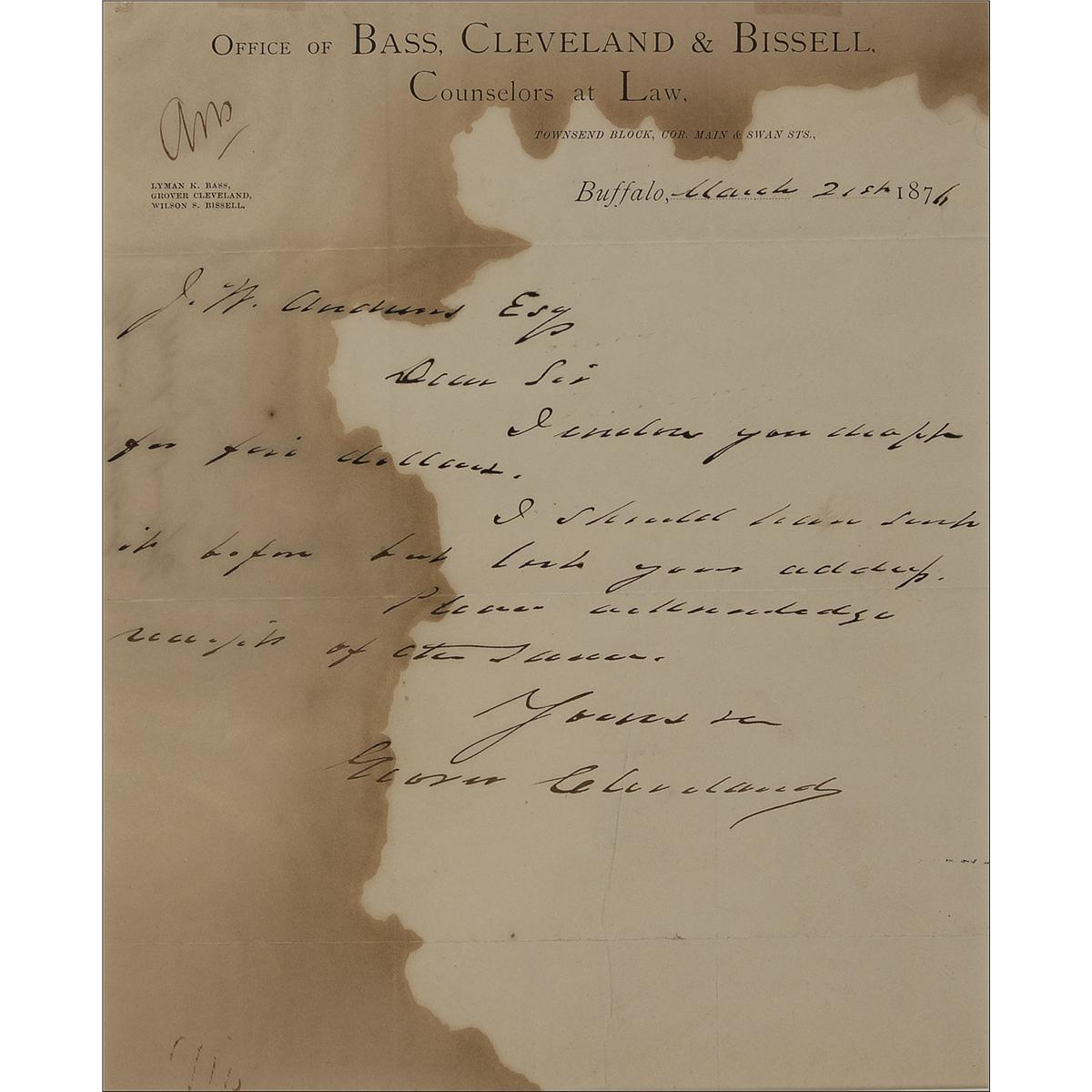 ALS, one page, 7.5 x 9.5, Office of Bass, Cleveland, & Bissell letterhead, March 21, 1876. Cleveland forwards five dollars to a gentleman. In part: “I enclose your draft for five dollars. I should have sent it before but lost your address.” Double matted and framed to an overall size of 13 x 15. In very good condition, with intersecting folds, two through a single letters of signature, moderate damp staining to left and top edge, affecting portions of text, and a vertical crease through another letter of signature.