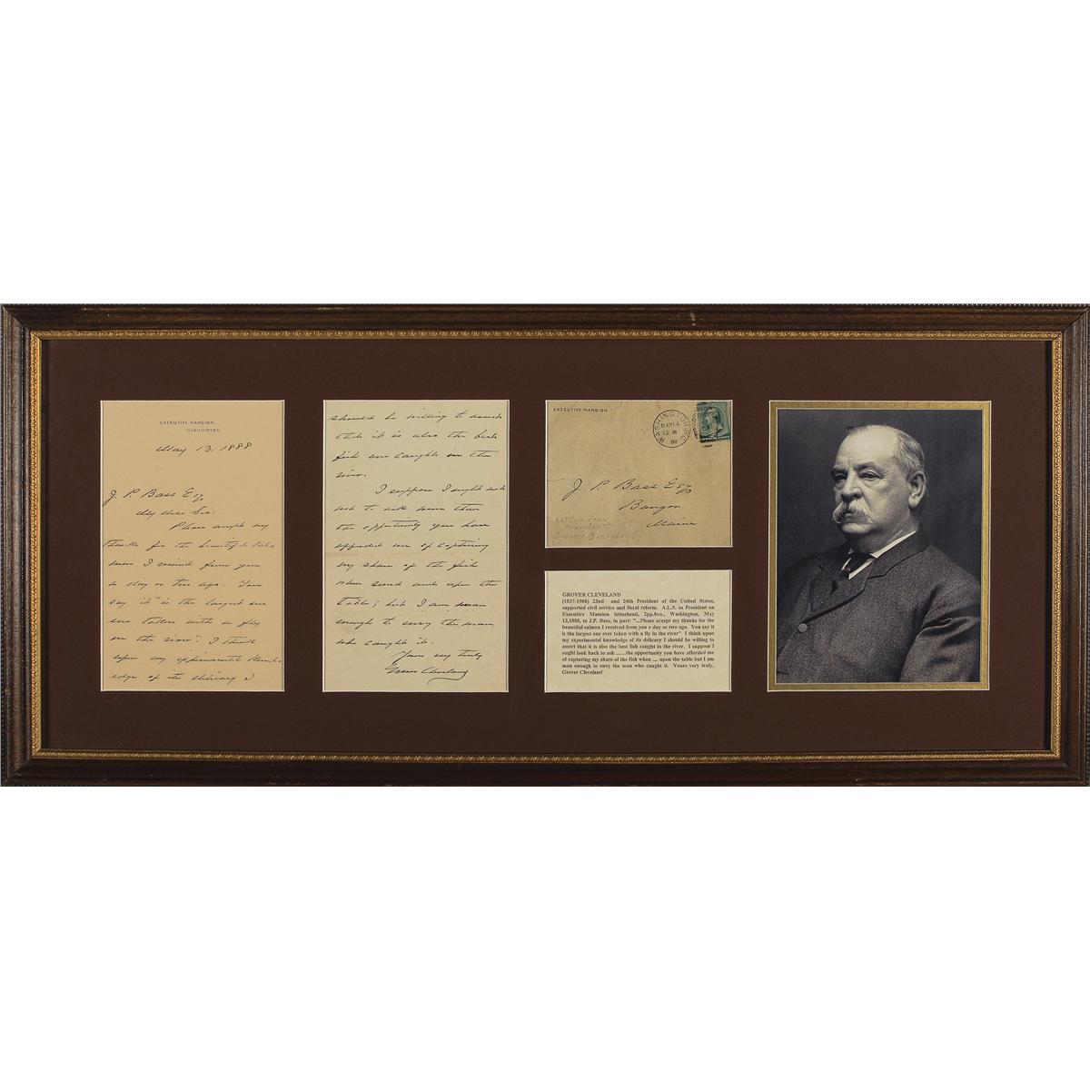 ALS as president, two pages, 4.75 x 7.5, Executive Mansion letterhead, May 13, 1888. Letter of thanks to J. P. Bass, sending thanks for a gift of salmon. In part: “Please accept my thanks for the beautiful salmon I received from you a day or two ago. You say it ‘is the largest one ever taken with a fly in the river.’ I think upon my experimental knowledge of its delicacy I should be willing to assert that it is also the best fish caught in the river…I am man enough to envy the man who caught it.” Matted and framed with the original Executive Mansion mailing envelope, a portrait of Cleveland, and a partial transcript of the letter, to an overall size of 28 x 12.5. In fine condition, with a uniform shade of toning to first page, some light mirroring of ink on second page of letter and toning and wear to envelope. Oversized.