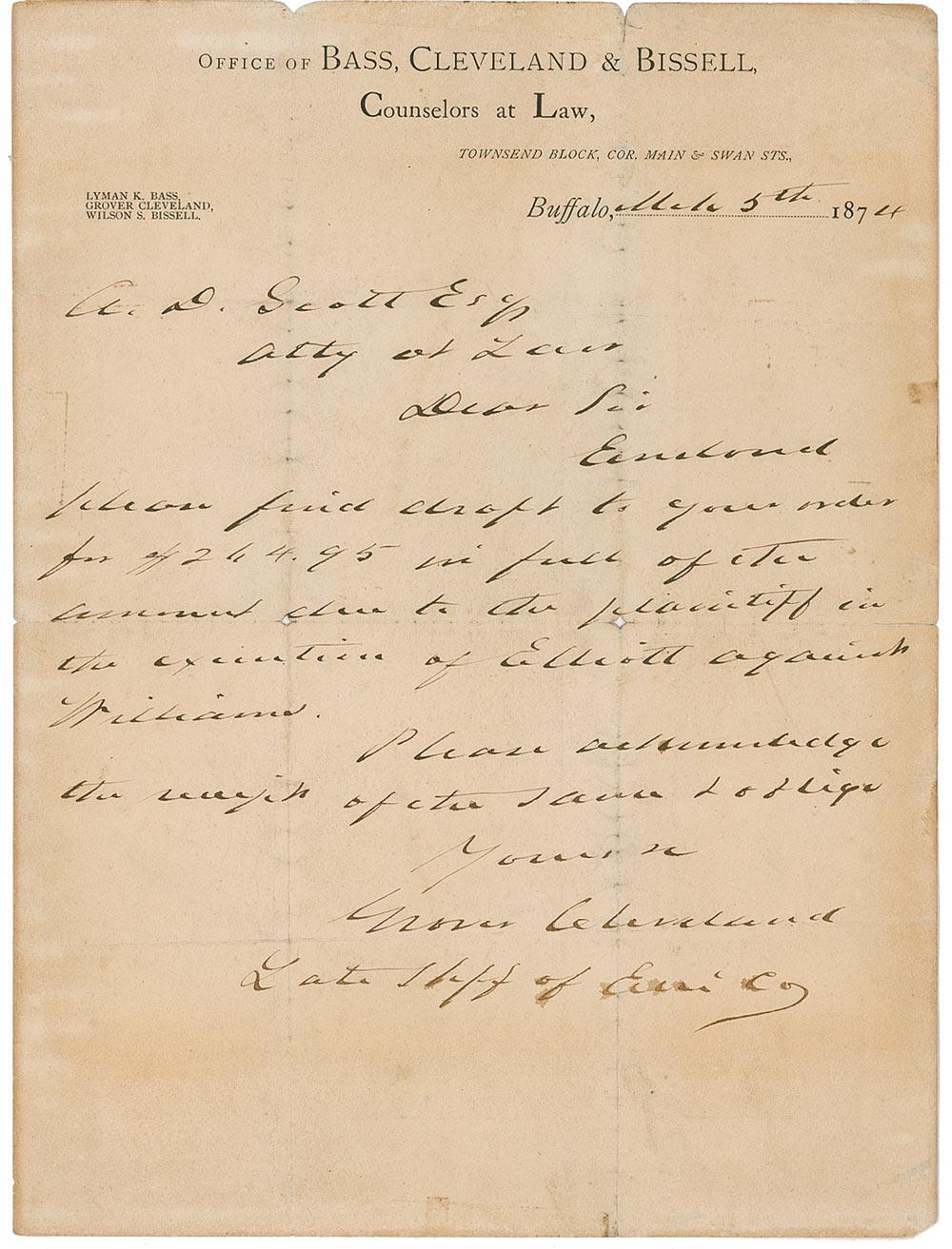 ALS signed “Grover Cleveland, late She[ri]ff of Erie Co.,” one page, 8 x 10.5, on letterhead of the Office of Bass, Cleveland & Bissell, March 5, 1874. Letter to attorney A. D. Scott. In full: “Enclosed please find draft to your order for $264.95 in full of the amount due to the plaintiff in the execution of Elliott against Williams. Please acknowledge the receipt of same & oblige.” Intersecting folds, one through a single letter of signature, scattered moderate toning and soiling, a couple small areas of paper loss at fold junctions and fold edges, and some light pooling of ink to Cleveland’s title, otherwise very good condition. This letter reflects Cleveland’s pride in having been sheriff of Erie County, New York—a position he held from 1871 to 1873. Even upon leaving office, he made certain that he added “late Sheff of Erie Co.” to his correspondence, as shown here. He eventually formed a law partnership with two of his friends, Lyman K. Bass and Wilson S. Bissell—the other two men identified on this stationery. The firm was dissolved in 1882 after Cleveland became mayor of Buffalo, New York. In 1893, President Cleveland remembered his old partner, naming Bissell his postmaster general. This is a unique addendum to Cleveland’s signature from a sometimes forgotten role in his life.