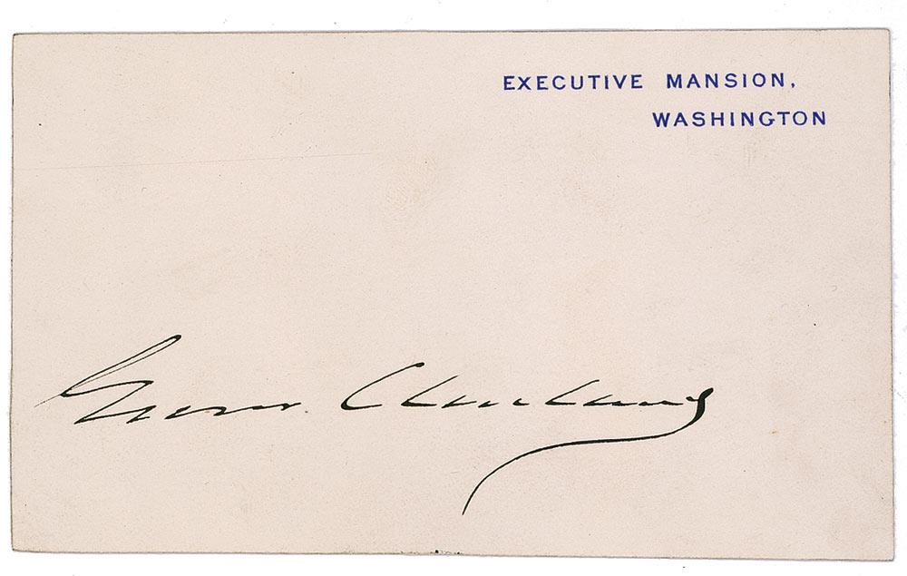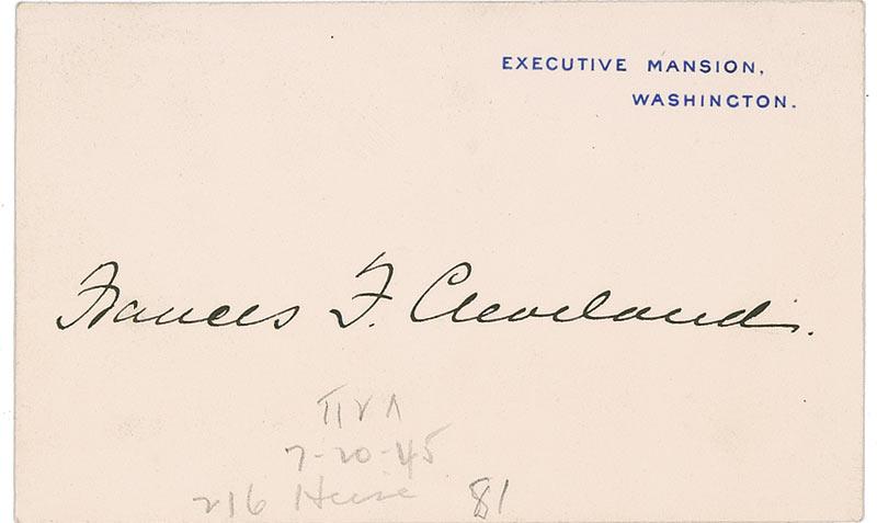 Two Executive Mansion cards, signed in black ink, “Grover Cleveland” and “Frances F. Cleveland” respectively. Spots of soiling, Grover Cleveland’s card trimmed, and pencil collector notations to the first lady’s card, otherwise fine condition.