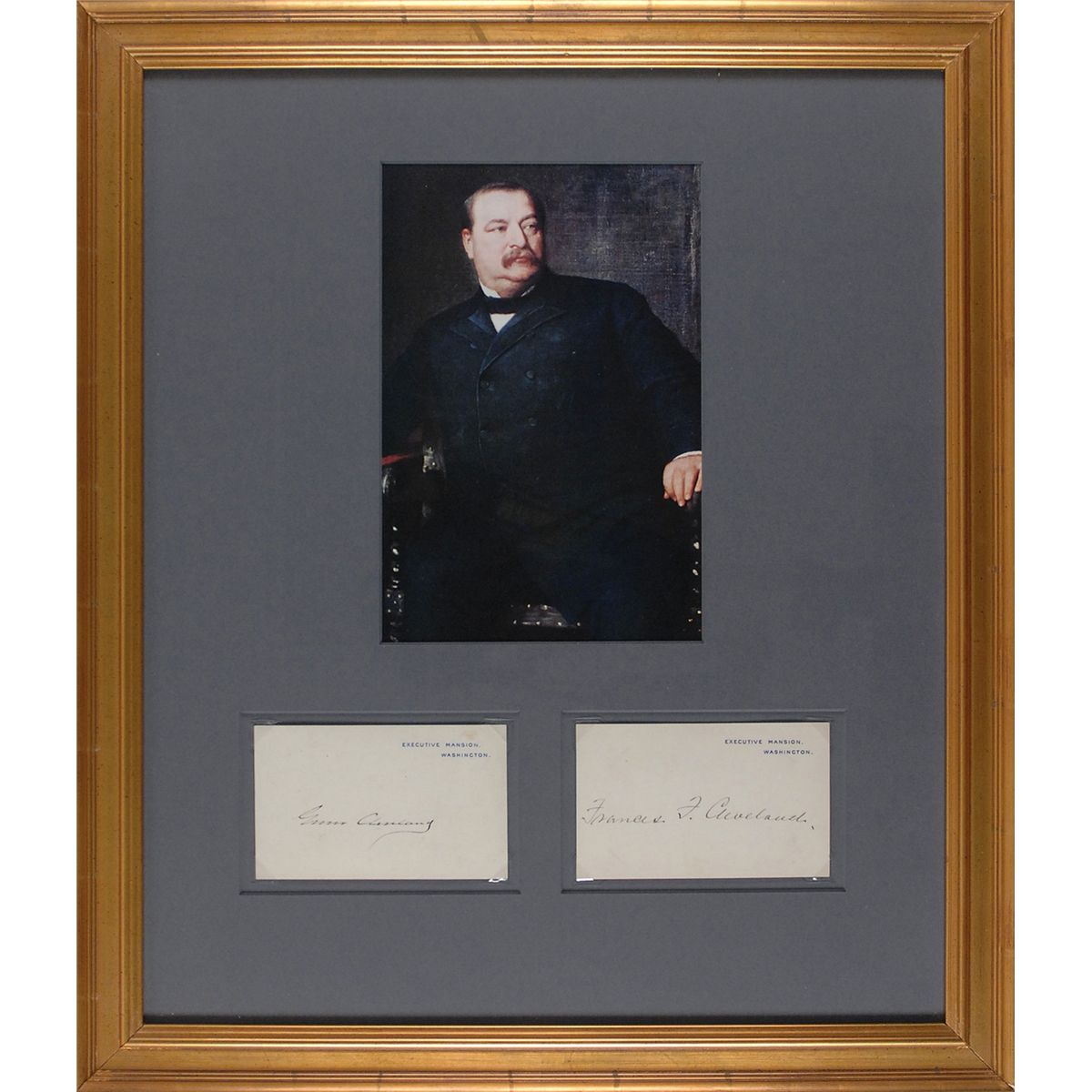 Two Executive Mansion cards, signed in black ink, “Grover Cleveland,” and “Frances F. Cleveland,” respectively. Both are removably matted and framed with a color portrait of Cleveland to an overall size of 16.5 x 19.25. Some scattered light soiling to both, none affecting either of the crisp signatures, otherwise fine condition.