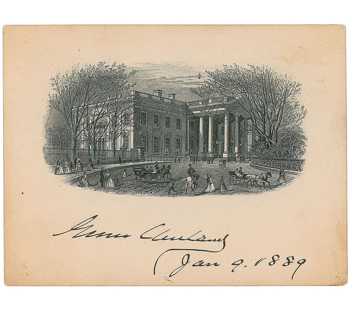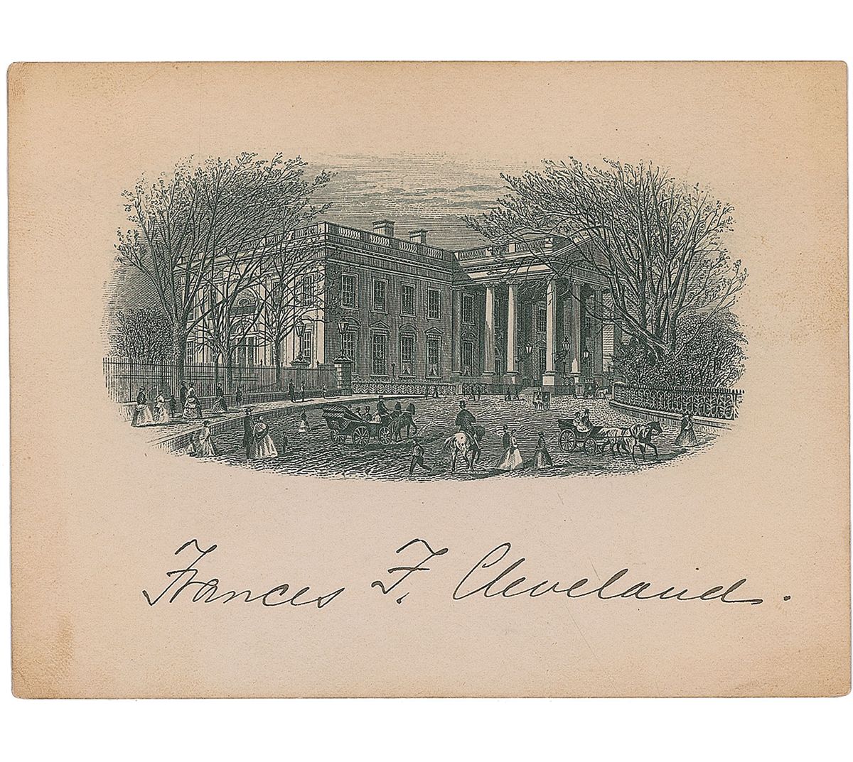 Two handsome 4.75 x 3.5 engravings of the exterior of the White House, one signed in the lower border in black ink as president, “Grover Cleveland, Jan. 9, 1889” and the other signed in black ink, “Frances F. Cleveland.” In overall fine condition, with toning to edges.